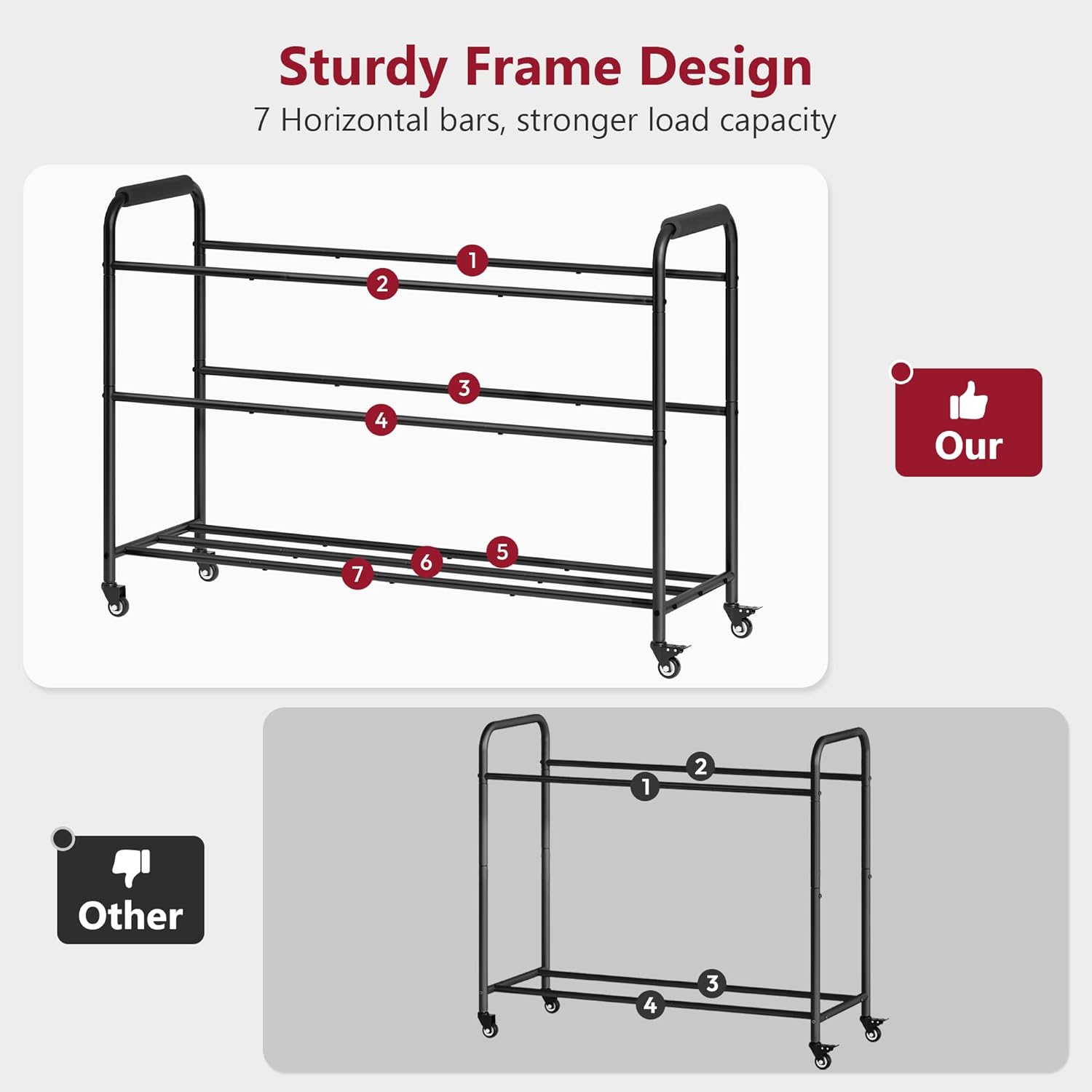 - 【Sturdy Metal Frame】Made of high-quality metal, it has good load-bearing performance. 7 metal horizontal bars make the rolling laundry sorter frame more stable, and the horizontal bars at the bottom of the laundry hamper prevent the bags from sagging when loading clothes.