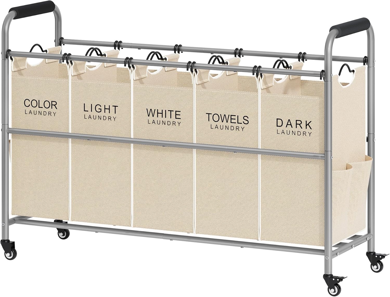 Tajsoon Laundry Sorter 5 Sections, Laundry Hamper with Heavy Duty Lockable Wheels and Removable Bags, 5 Bag Rolling Laundry Sorter Cart for Dirty Clothes Storage, Laundry Separator Hamper, Beige