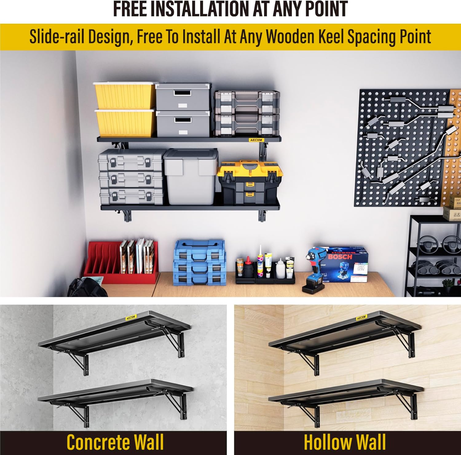 - SUPERIOR DESIGN: The foldable garage storage shelf panel is made of whole steel plate, The surface of matte high temperature powder baking paint, Flat and smooth, Panel with sliding rail design, The bracket can be installed freely in the range of 8"-33" spacing of wood wall keel, And at the same time it adopts folding bracket, Which can be freely stowed away or unfolded
