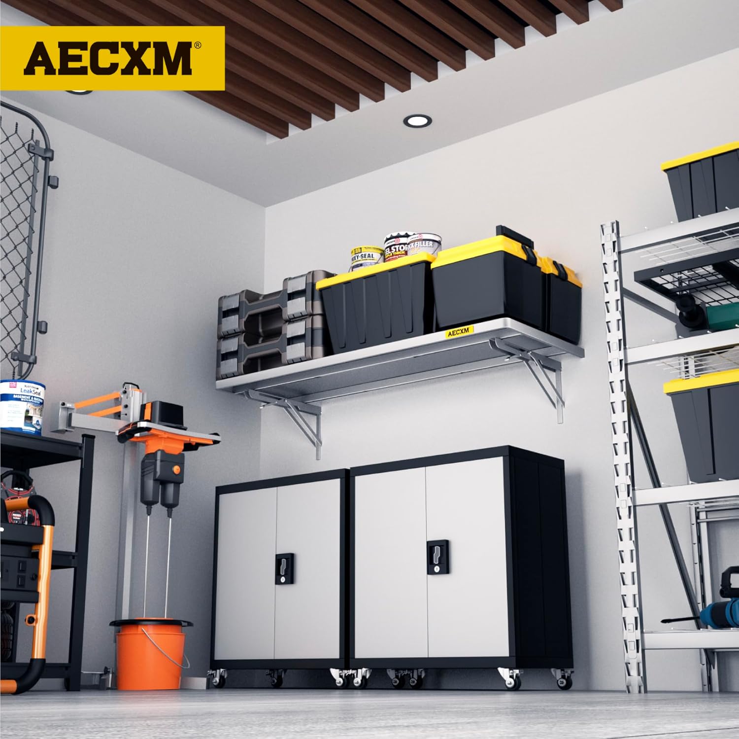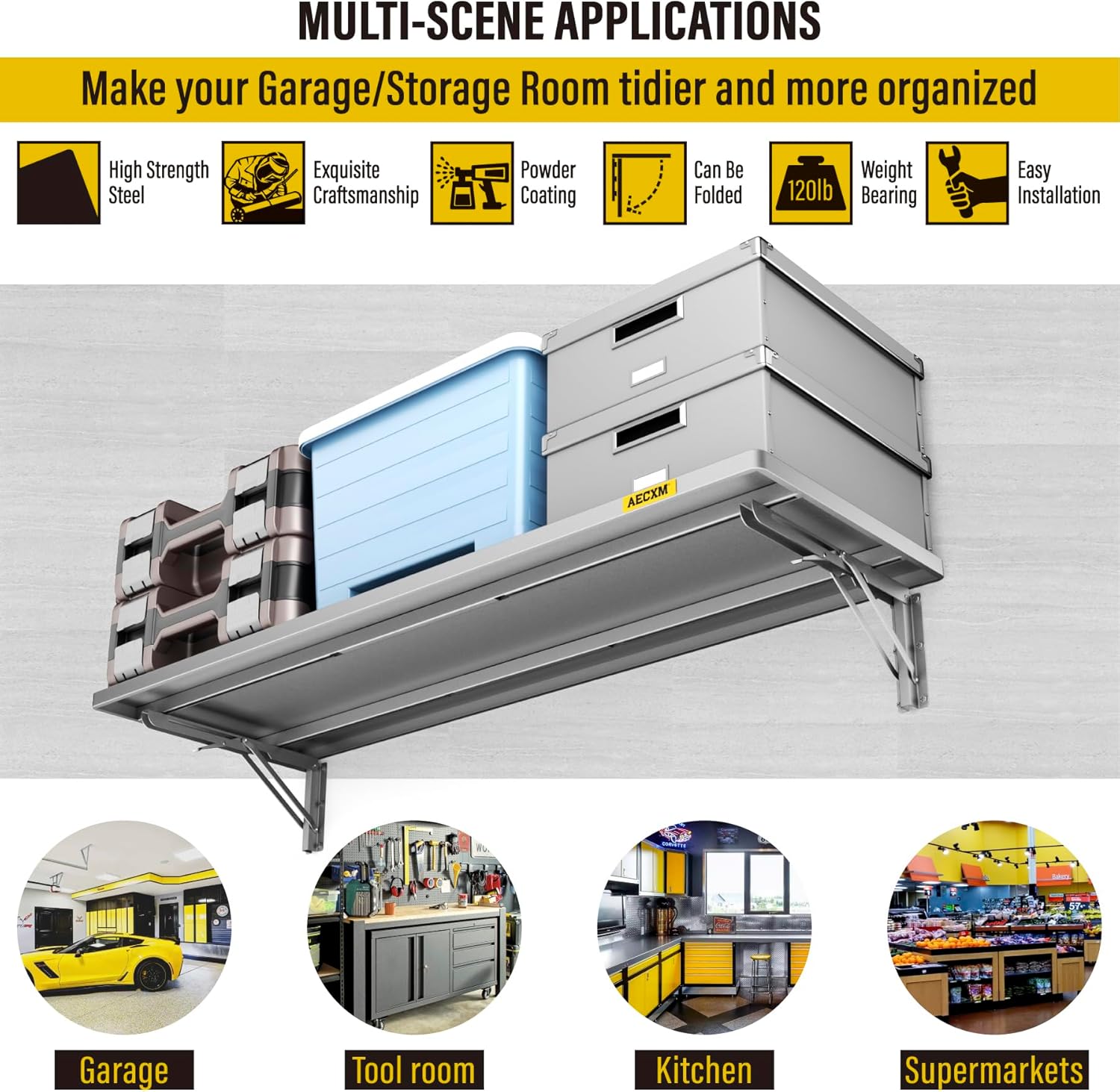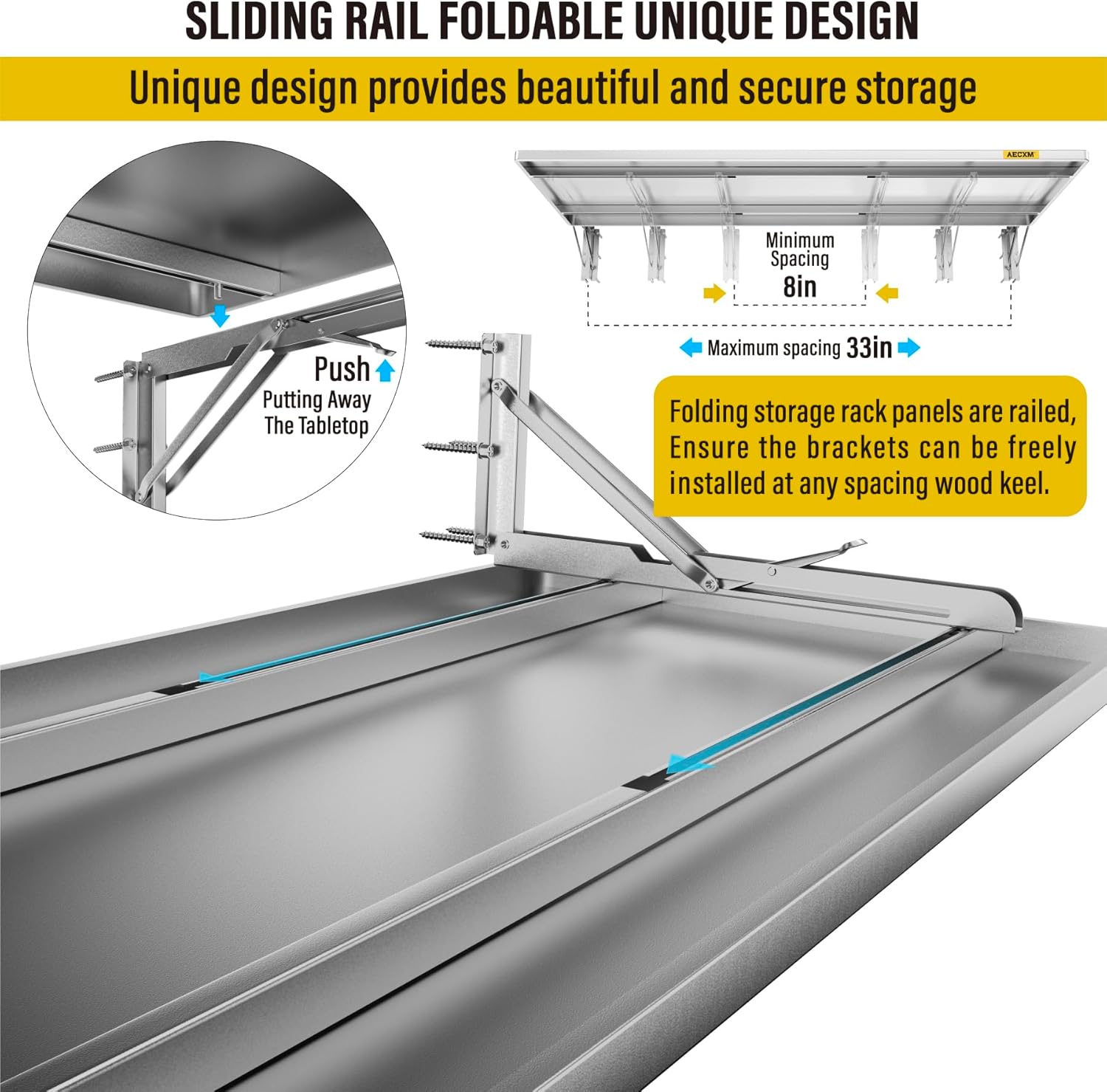 - SUPERIOR DESIGN: The foldable garage storage shelf panel is made of whole steel plate, The surface of matte high temperature powder baking paint, Flat and smooth, Panel with sliding rail design, The bracket can be installed freely in the range of 8"-33" spacing of wood wall keel, And at the same time it adopts folding bracket, Which can be freely stowed away or unfolded