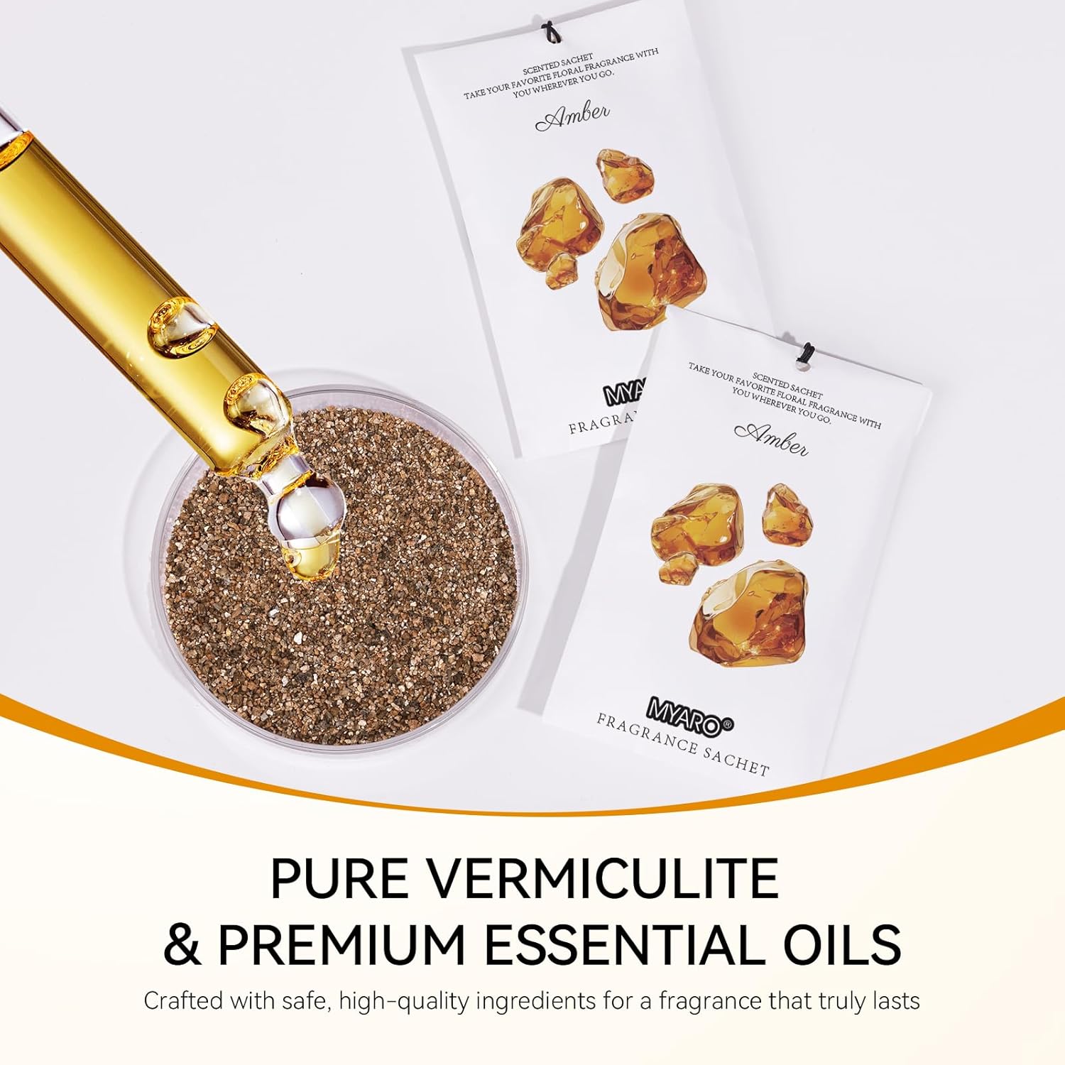 - MYARO Amber Sachet Bags: Includes 12 scented sachets (each bag size: 4.13 inch x 2.76 inch). Our natural fragrance will take you on a journey with the amber fresh scents sachet packets
