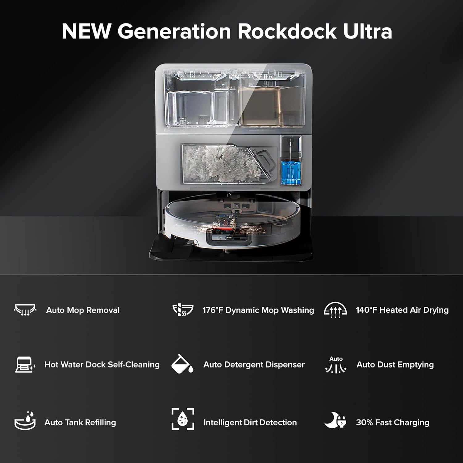 - All-in-One Dock: The New Generation RockDock Ultra is an advanced docking station featuring 176°F hot water mop washing, dynamic temperature settings for different stains, 140°F heated air drying, and self-cleaning with warm water. It includes an intelligent dirt detection system, auto detergent dispenser, self-refilling, fast charging, and off-peak charging, ensuring a spotless home with minimal effort.