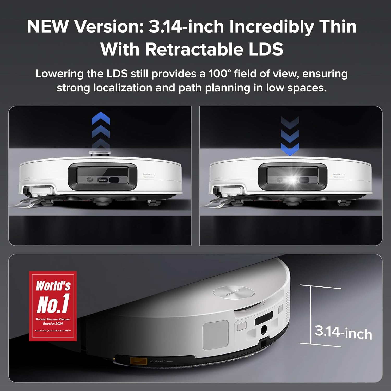 - Reach the Unreachable: Featuring a sleek 3.14-inch ultra-thin design, the retractable LDS and RGB camera collaborate for optimal Dirt Detection. The top-mounted ToF sensor smartly adjusts the LDS height, maintaining a 100° viewing angle even in low-light and tight spaces for comprehensive cleaning coverage.