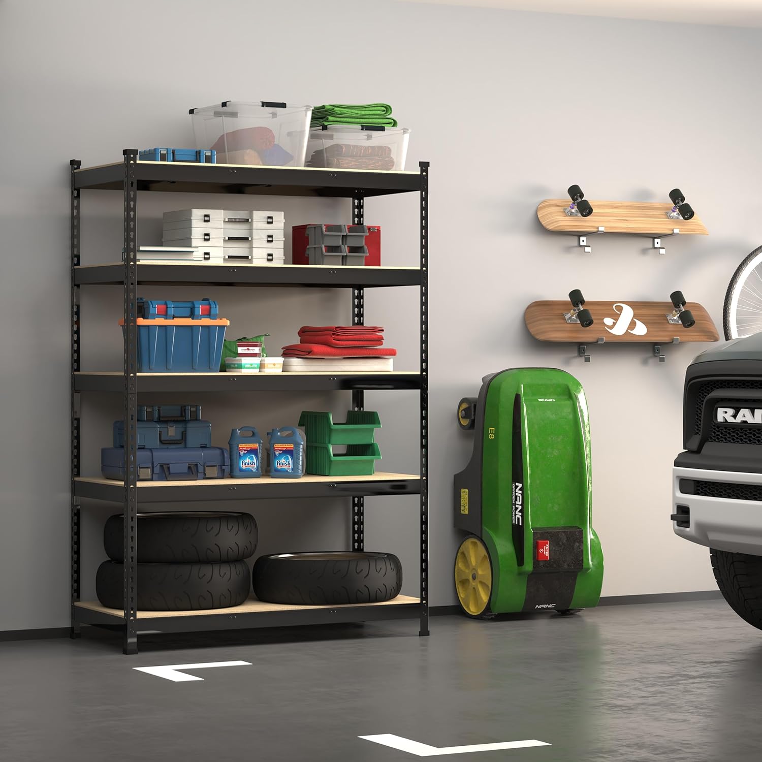 - ăHeavy Duty Garage Shelving UnităThe 5-tier heavy duty garage storage shelving unit is constructed from high-quality thick MDF boards and a heavy-duty metal frame with a premium powder-coated finish surface. Each shelf layer is equipped with 2 middle support beams. It's not only sturdy and long-lasting, but also ensures the shelf maintains its appearance and performance in various environments. Each shelf holds up to 600 lbs, 5 tier shelves' total max load weight is 3000 lbs