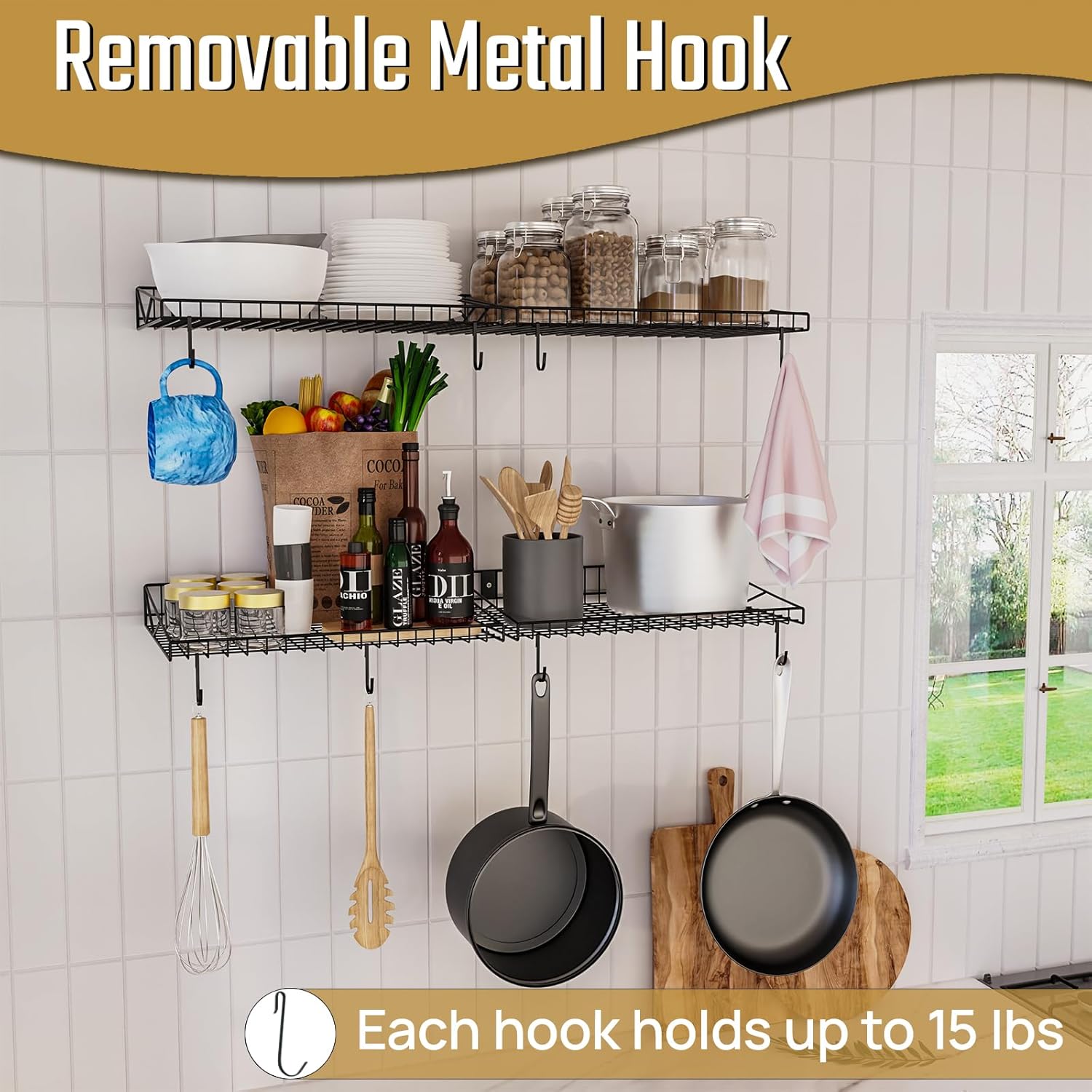 2 Pack Garage Wall Shelf, Garage Wall Mounted Shelving, Heavy Duty Floating Shelves With 4 Hooks, Loads 90 LBS Black Wall Shelves Mesh Storage Rack for Office, Basement, Wall Cabinet and Kitchen