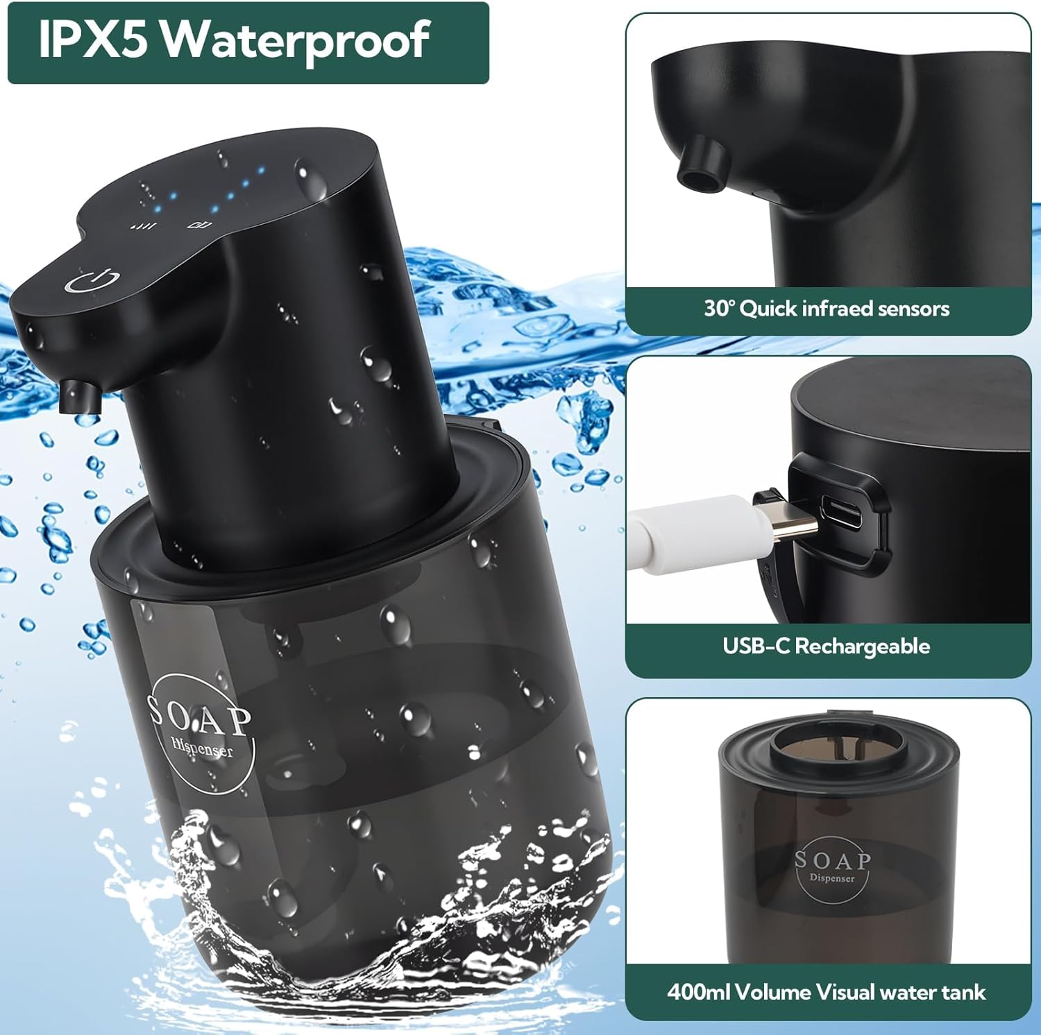 - 【IPX5 Waterproof & Leak-Proof Design】The IPX5 waterproof rating protects the dispenser from soap and water damage, while the rubber plug covering the USB charging port ensures leak-proof performance, making it reliable for use in wet environments like bathrooms and kitchens.