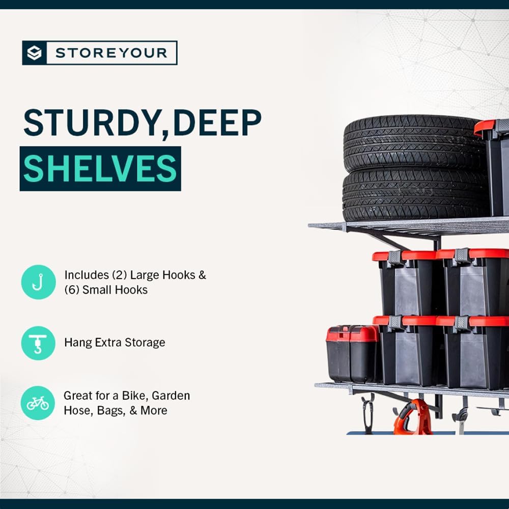 - INCLUDES STORAGE HOOKS – Comes with 2 large and 4 small garage hooks for added hanging storage under each wire shelf. Use the hooks for cords, garden tools, bags, or garage wall organizer systems. Maximize vertical space while keeping frequently used tools within reach.