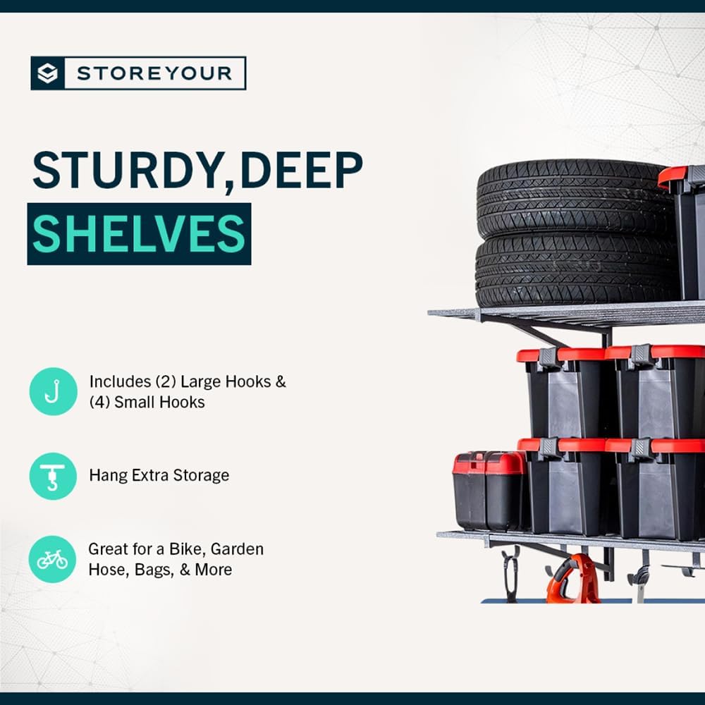 - INCLUDES STORAGE HOOKS – Comes with 2 large and 4 small garage hooks for added hanging storage under each wire shelf. Use the hooks for cords, garden tools, bags, or garage wall organizer systems. Maximize vertical space while keeping frequently used tools within reach.