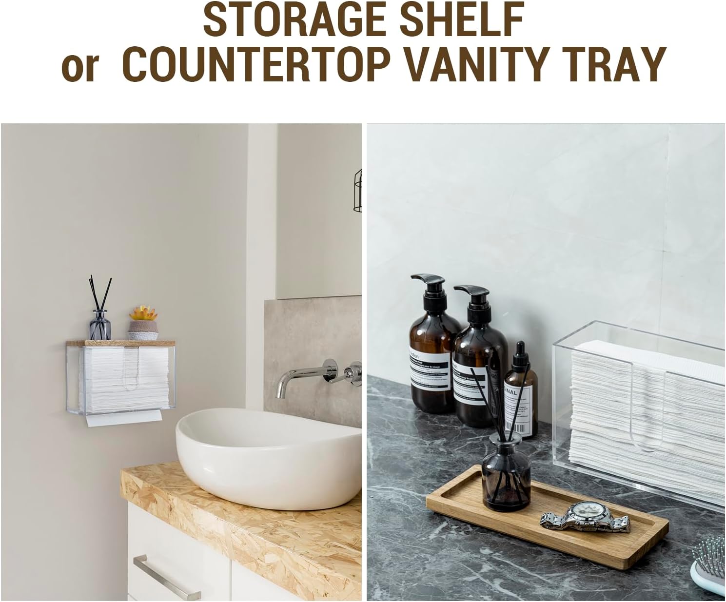- Wall mounted folded paper towel holder and wooden display tray for commercial guest use in a bathroom, kitchen, office break room, and more
