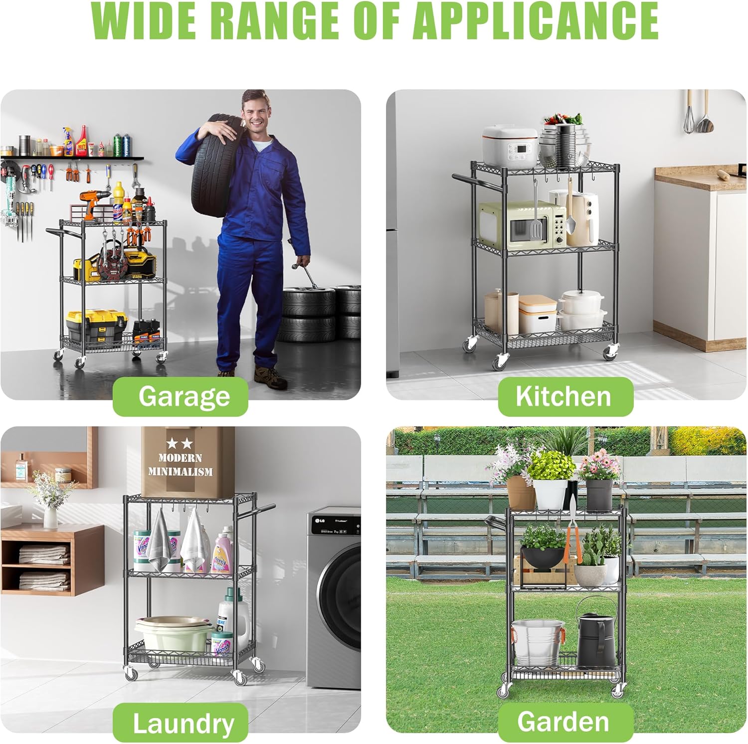 - 【Rust & Scratch Resistant】Kitchen Carts on Wheels surface adopts high-quality electroplating coating process, the surface is glossy and bright, scratch-resistant and wear-resistant, which can prevent rust, corrosion or water penetration, and is very suitable for use in kitchens, warehouses, garages, gardens, and offices