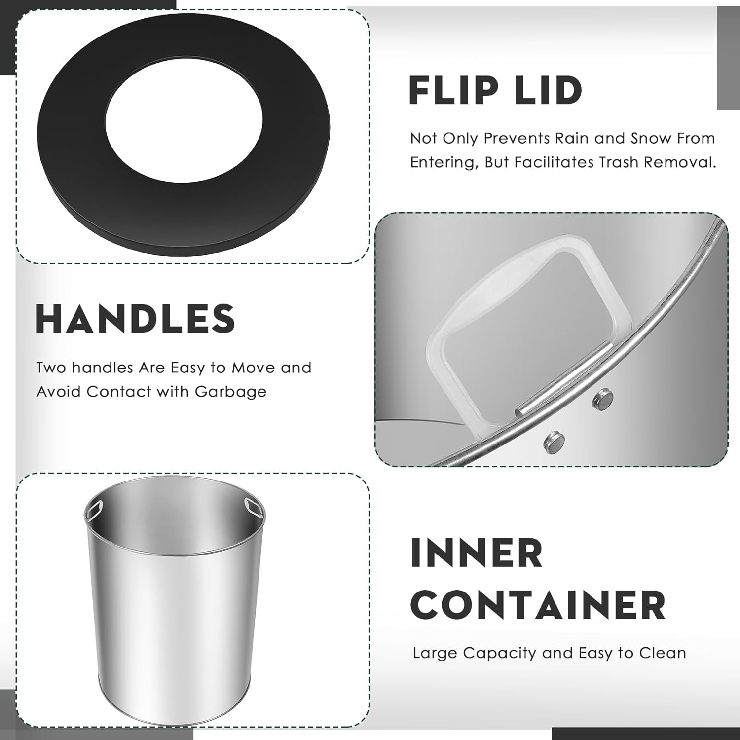 - 【Easy-to-Clean Metal Liner Feature】Our incorporated metal liner simplifies maintenance. When it's time to empty the trash, you can swiftly remove the liner, dump the waste, and wipe it clean with ease. This convenience is especially crucial in high-traffic areas like schools, hospitals, and shopping malls. It saves cleaning time and effort, allowing for efficient waste management.