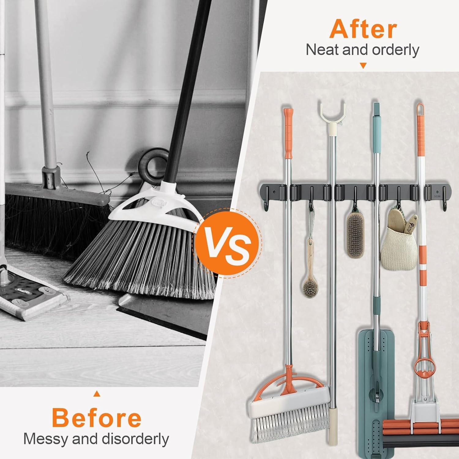 - ORGANIZE AND SAVE SPACE:Say goodbye to messy tools or clutter! Broom holder helps you free up more storage space. This broom and mop holder is a home essential with 4 gripers and 5 utility hooks, allows you to hold brooms, mops, dustpans, brushes, rakes, garden tools, etc