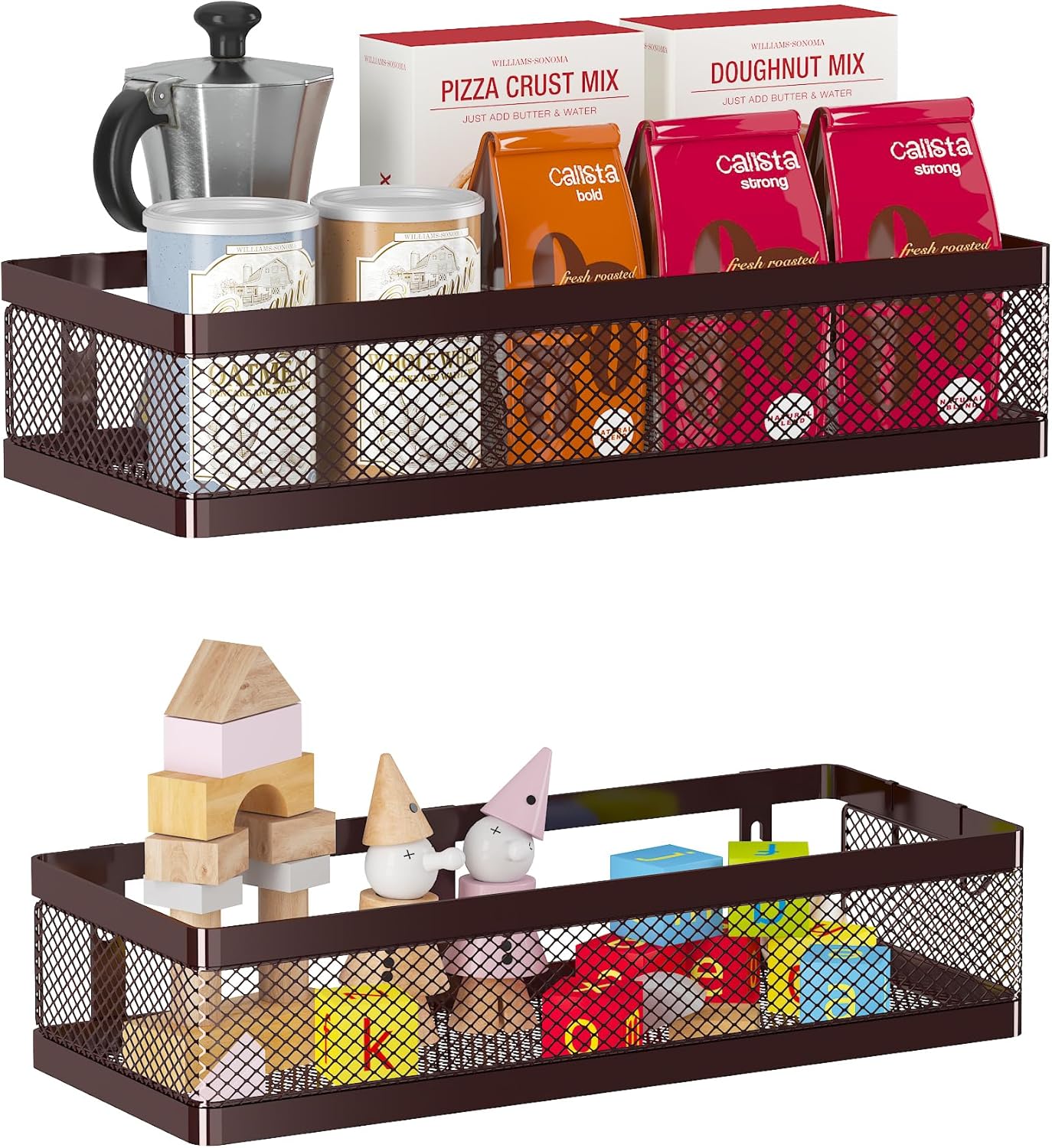 - ăMULTI-PURPOSE&MULTIFUNCTIONALăThe perfect solution for organizing a multitude of every items indoor or outdoor. The cabinet organizer hanging baskets wall mount is Ideal for organizing and storing spice bottles, pantry items, snacks, toiletries, tools, craft supplies,etc. And this metal bin basket free up enough space for your homes, kitchen, living room, bathroom, camper, farmhouse, apartments, college dorm rooms, etc.