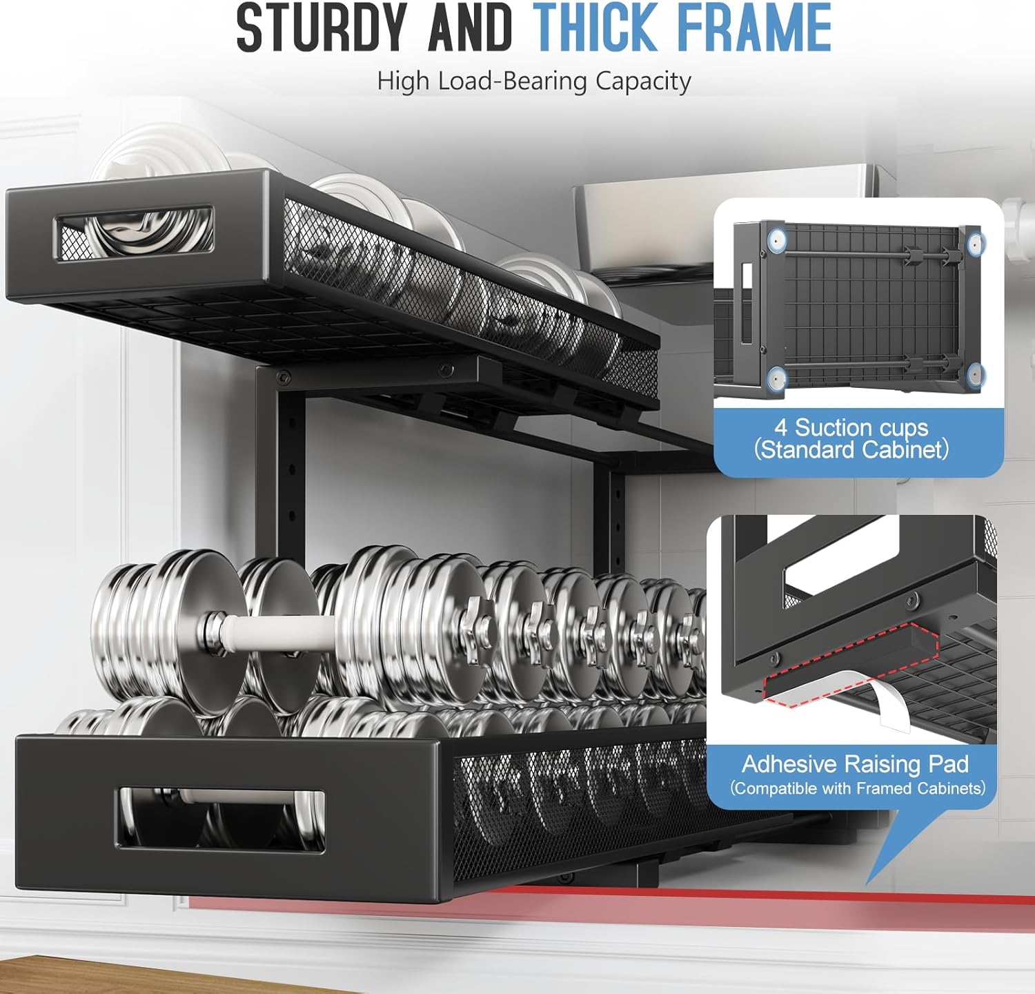 - 【2-Tier Pull-Out Design for Easy Access】This under-sink organizer features a double-layer pull-out design, allowing you to easily access items at the deepest part. The upgraded, thickened iron circular sliding rails ensure a smooth and seamless pulling experience, making each use effortless. The unique pull-out locking mechanism effectively prevents the drawers from being completely pulled out, avoiding the risk of items falling or structural damage caused by over-pulling, ensuring safer and more convenient use.