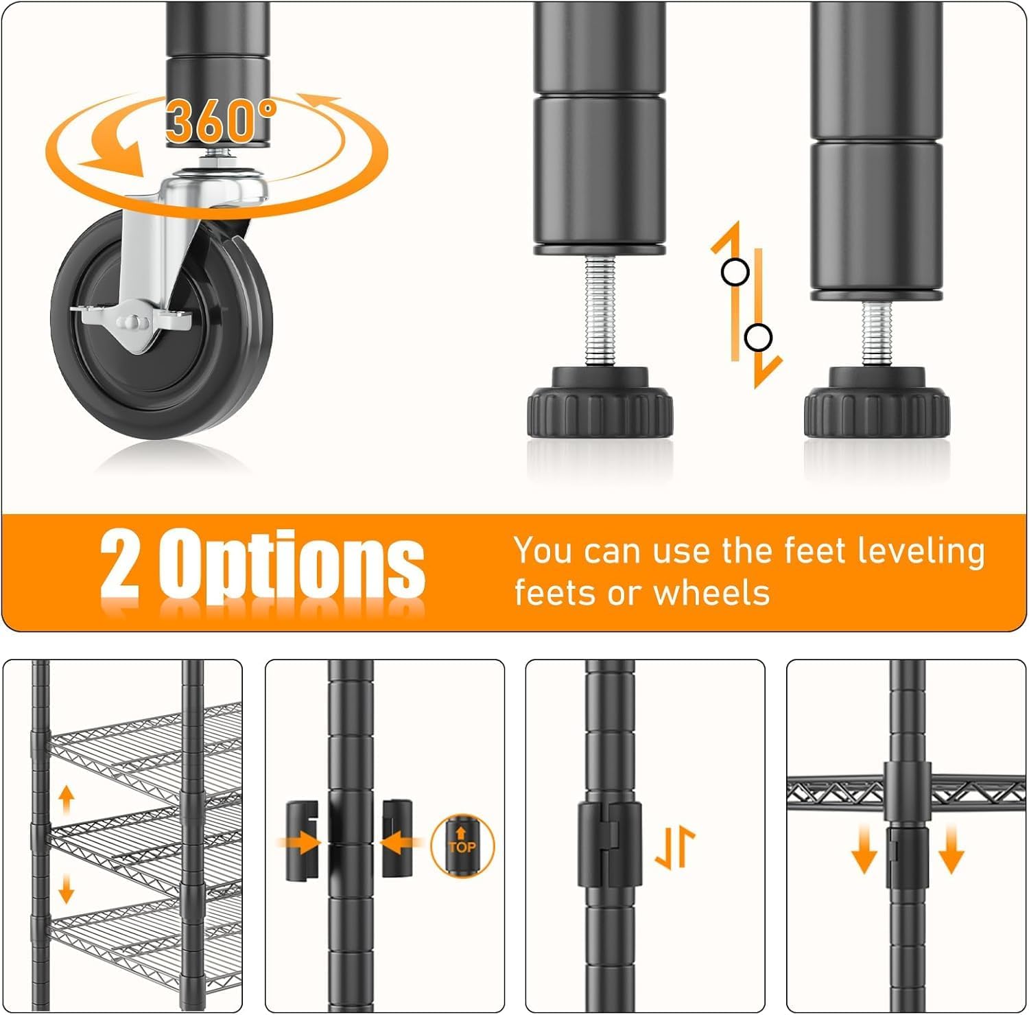 - 【ADJUSTABLE SHELF】Each layer of the wire shelf can be adjusted to match the height of your items, optimizing your storage space. Additionally, you can join two storage racks to form a wider unit, providing extra width to meet your needs.No matter your requirements, you can assemble a shelf configuration that fits just right