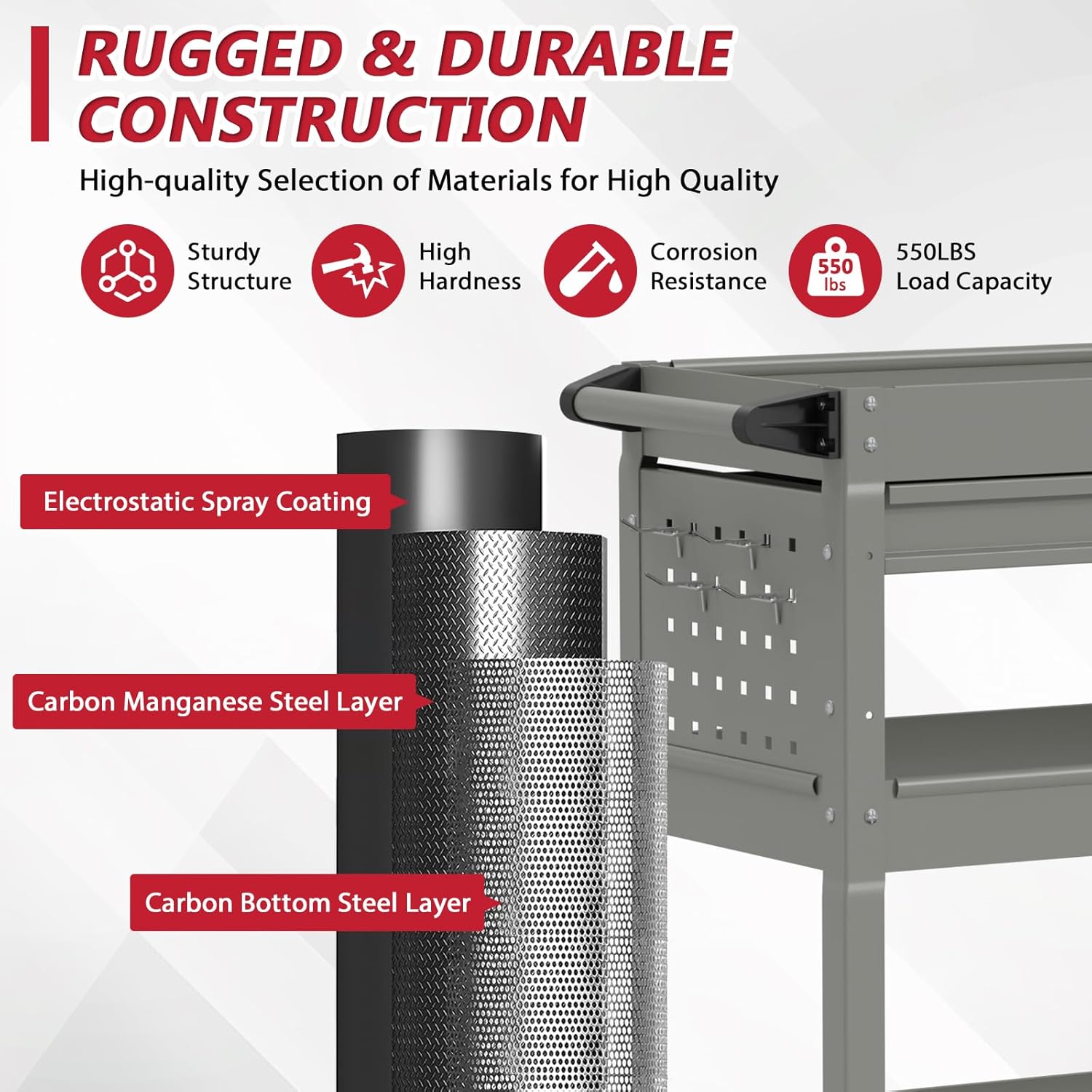 - š§°ćPremium Craftsmanshipć: Crafted with precision and attention to detail, the rolling tool cart on wheels is built to last, ensuring it stands up to the rigors of daily use. The maximum bearing capacity of the rolling tool cart is 550 pounds.