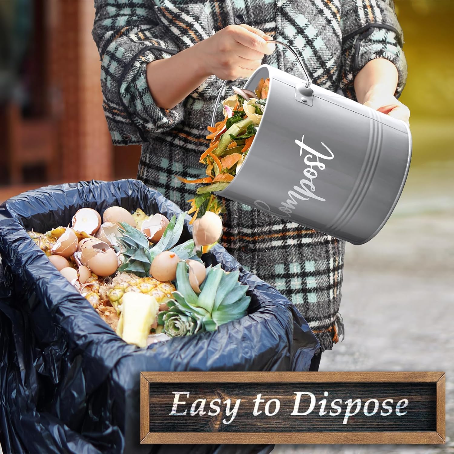 - Super Cute Farmhouse Design: Designed with the sleek text and vintage look style, this countertop compost bin will surely add a country charm to your kitchen countertops. This farmhouse compost bin fits perfectly with any modern farmhouse decor and cute kitchen accessories, you don’t need to hide this compost container below your sink.