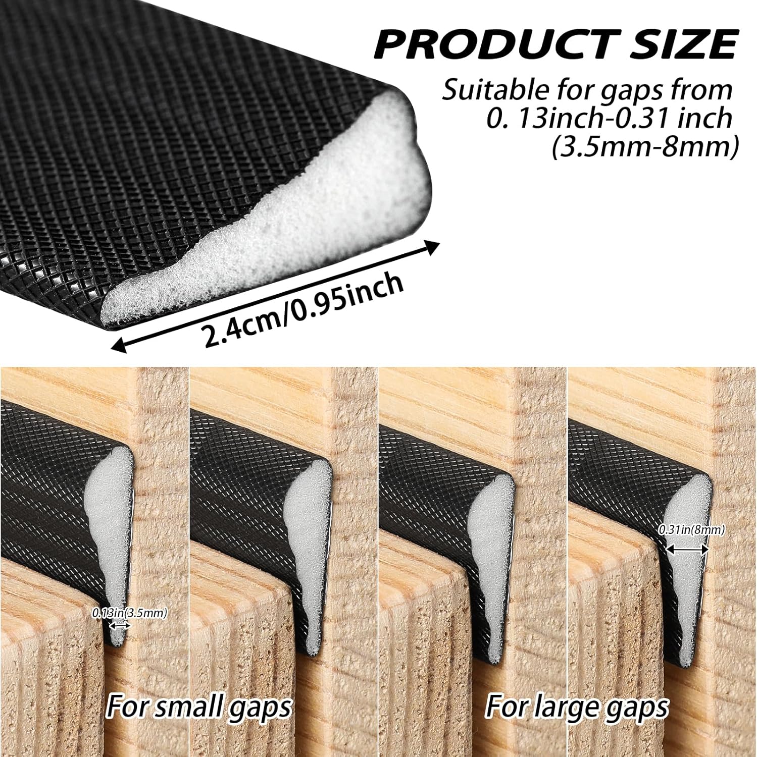 - Adaptable Design: The unique wedge-shape, with a wide edge of 9.5mm (0.38 inches) and a narrow edge of 2.5mm (0.1 inches), allows it to fit snugly into gaps ranging from 3.5mm to 8mm (0.13-0.31 inches). This flexibility ensures a perfect seal for any door or window frame