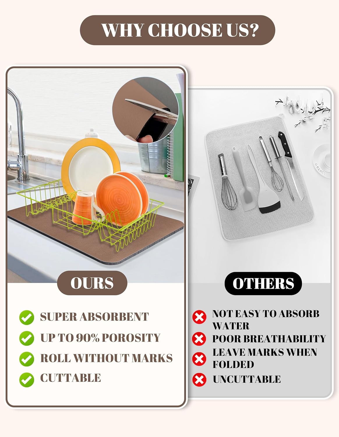 - Super Absorbent: Dish Drying Pad is made of super absorbent nano, the drying pad is soft and highly absorbent, which can dry quickly. In addition, the drying mat is thick enough to better protect countertops, tableware, and glassware from damage and contamination.