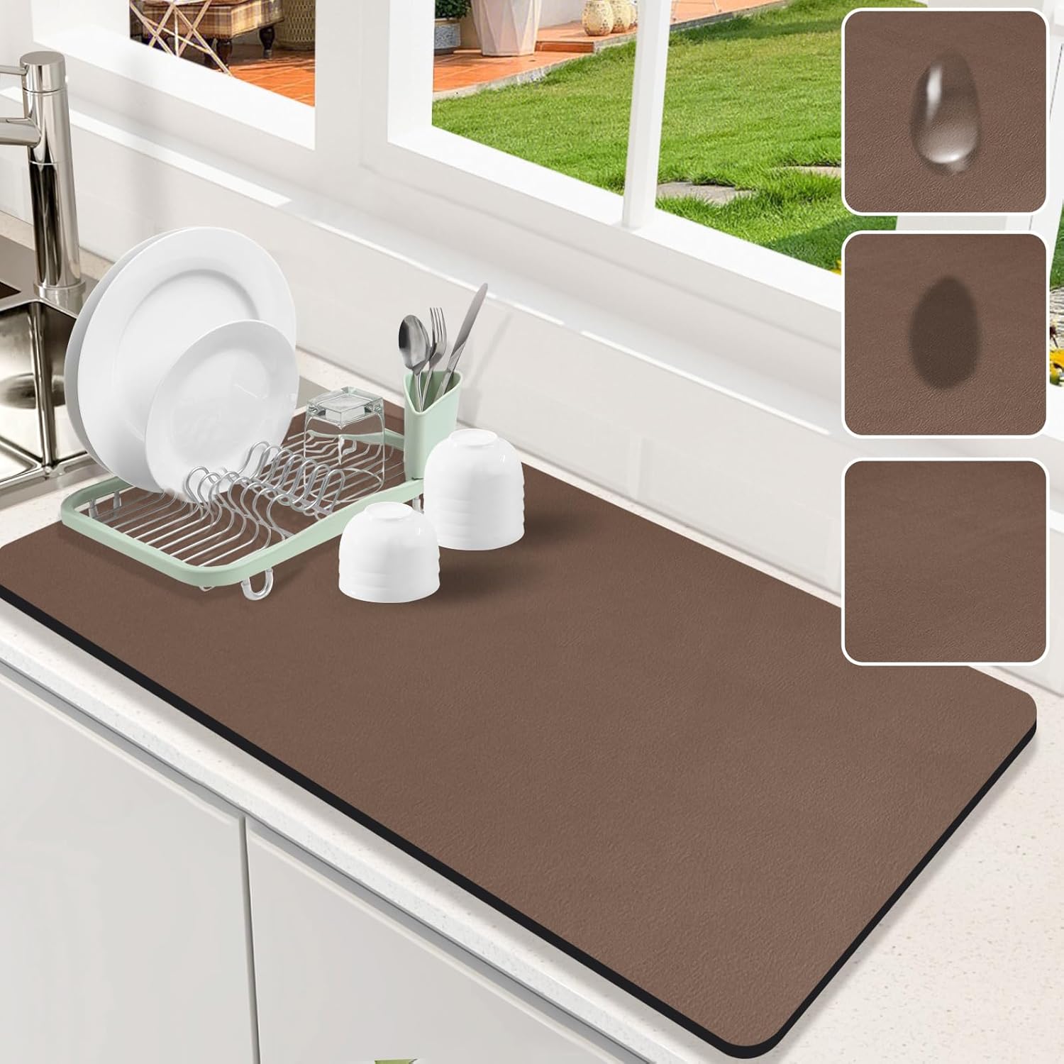 Dish Drying Mat for Kitchen Counter, 17" x 31.5"Dish Drying Pad with Non-slip Rubber Backed, Hide Stain Anti Absorbent for Kitchen Counter, Drying Mat for Coffee Machine Dish Rack (Brown)