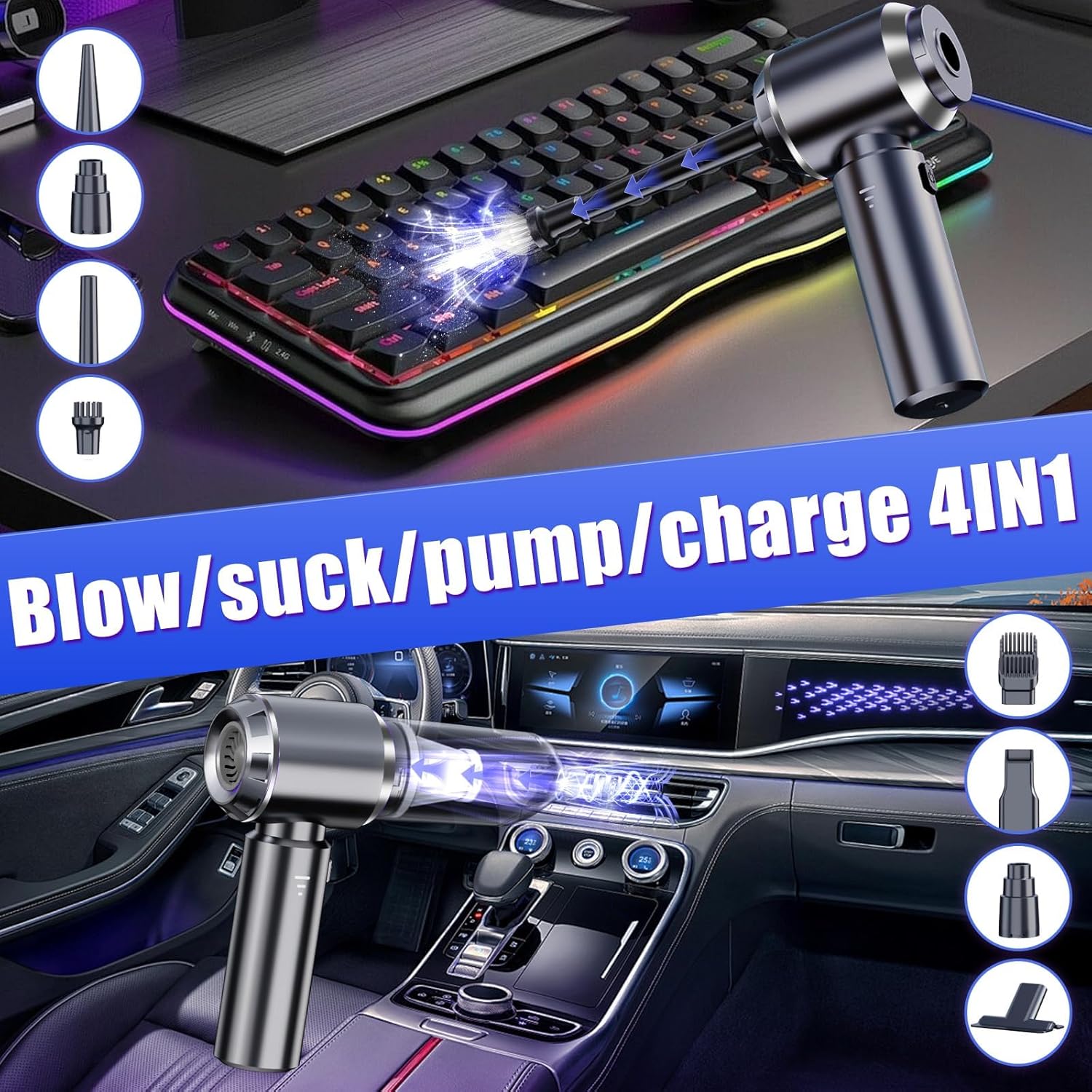 - 4-In-1 Multifunctional Mini Vacuum Cleaner】 The Automotive Car vacuum cleaner is designed to meet a variety of cleaning needs, including blowing, vacuuming, and pumping. It is not only suitable for cleaning hard-to-reach crevices such as computer keyboards and mainframes, but also effective in removing large stains from sofas, seats, and other areas. With its various attachments, this multifunctional car accessory ensures that every inch of your car seats – even those covered in dirt, leaves, and sand after every ride – can be meticulously cleaned up in a matter of seconds.