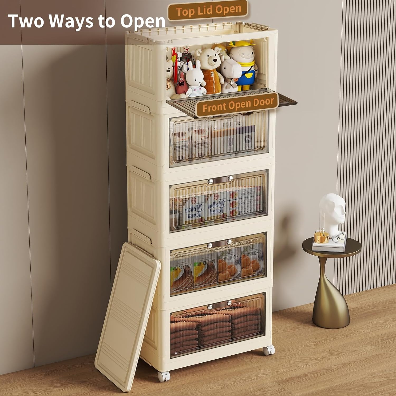 5 Tier - 34QT Storage Bins with Lids, Collapsible Storage Bins with Doors and Wheels, Plastic Storage Cabinet for Easy Storage and Organization for Living Room, Office