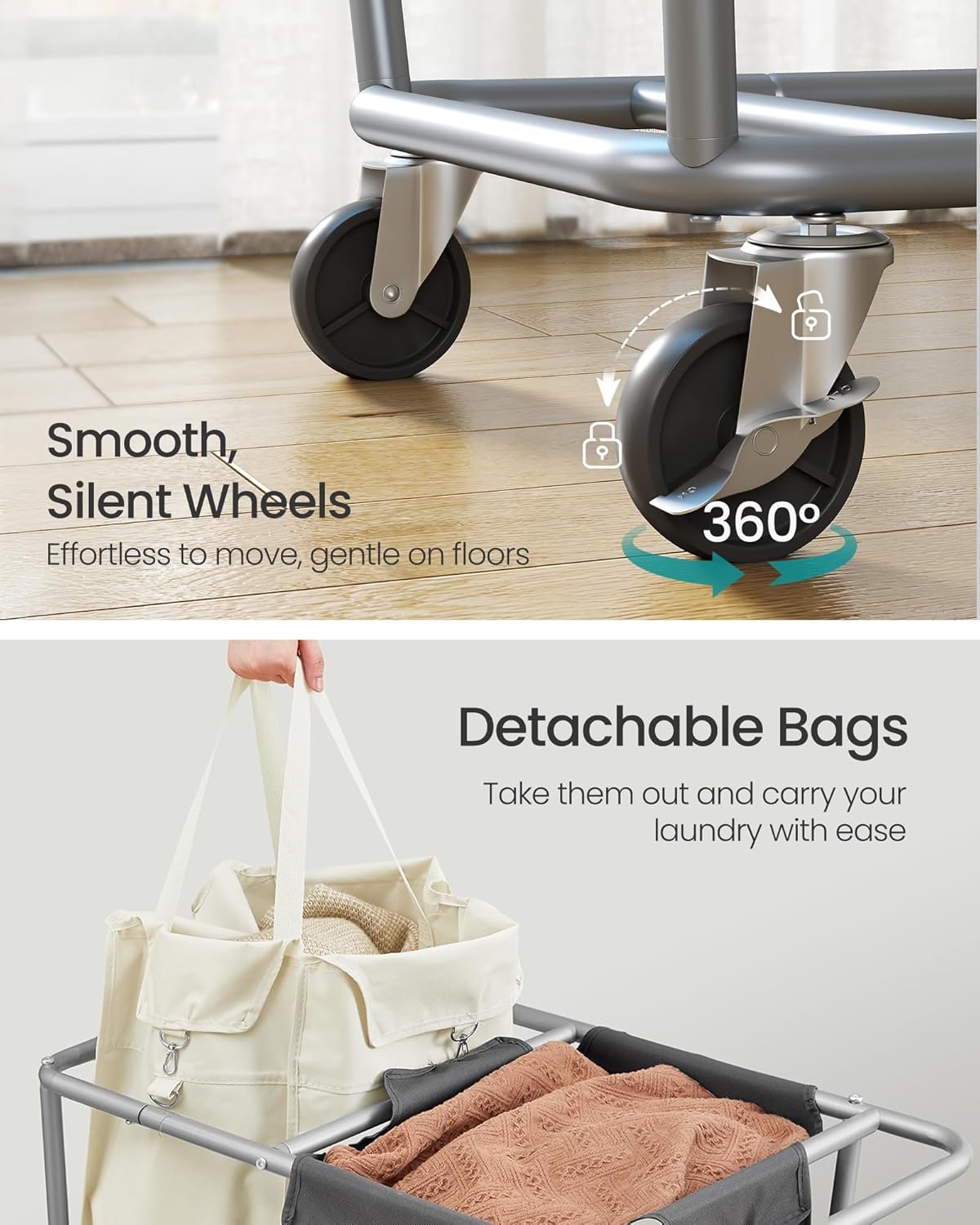 - Heavy-Duty Frame: Crafted with thick steel tubes, the rolling laundry basket stands up to daily use and supports heavy loads up to 66 lb without losing its shape