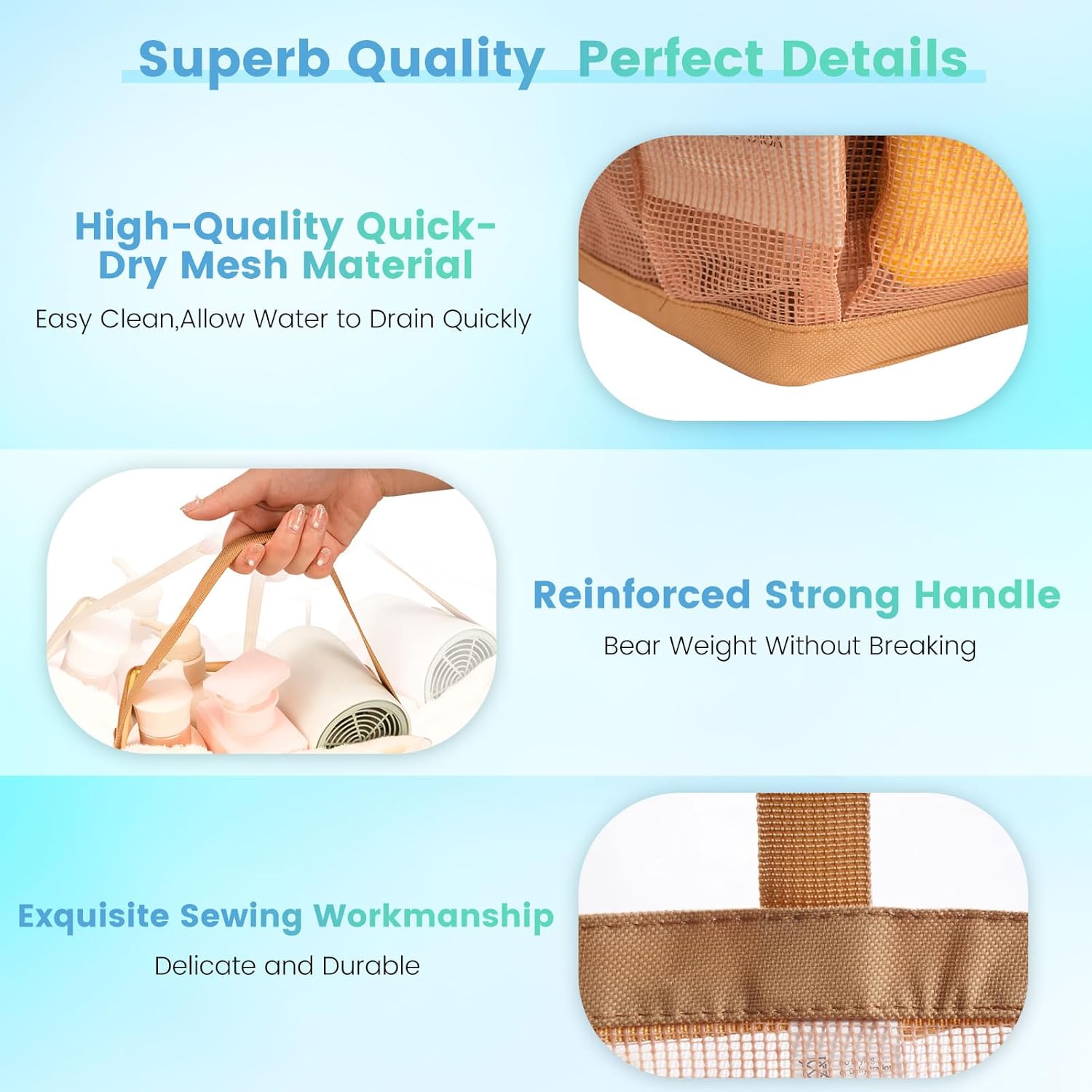 - Selected Mesh, Superior Durability:Crafted from quality mesh fabric, this portable shower caddy is built for daily use and long-lasting durability. It holds heavy items without tearing, and reinforced handles make it easy to hang, keeping your essentials within reach all the time.