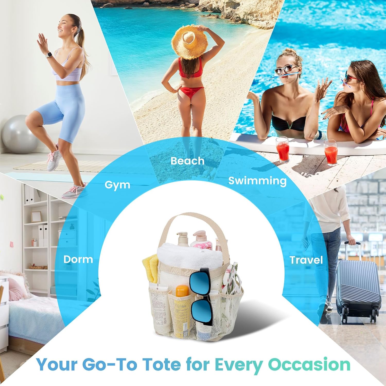 Mesh Shower Caddy for College Dorm Room Essentials for Girls with 9 Pockets,Large-Capacity Shower Basket,Quick Dry Toiletry Tote Bag for Women,Outdoor Gym,Travel,Swim,Beach Camping Essentials-Beige