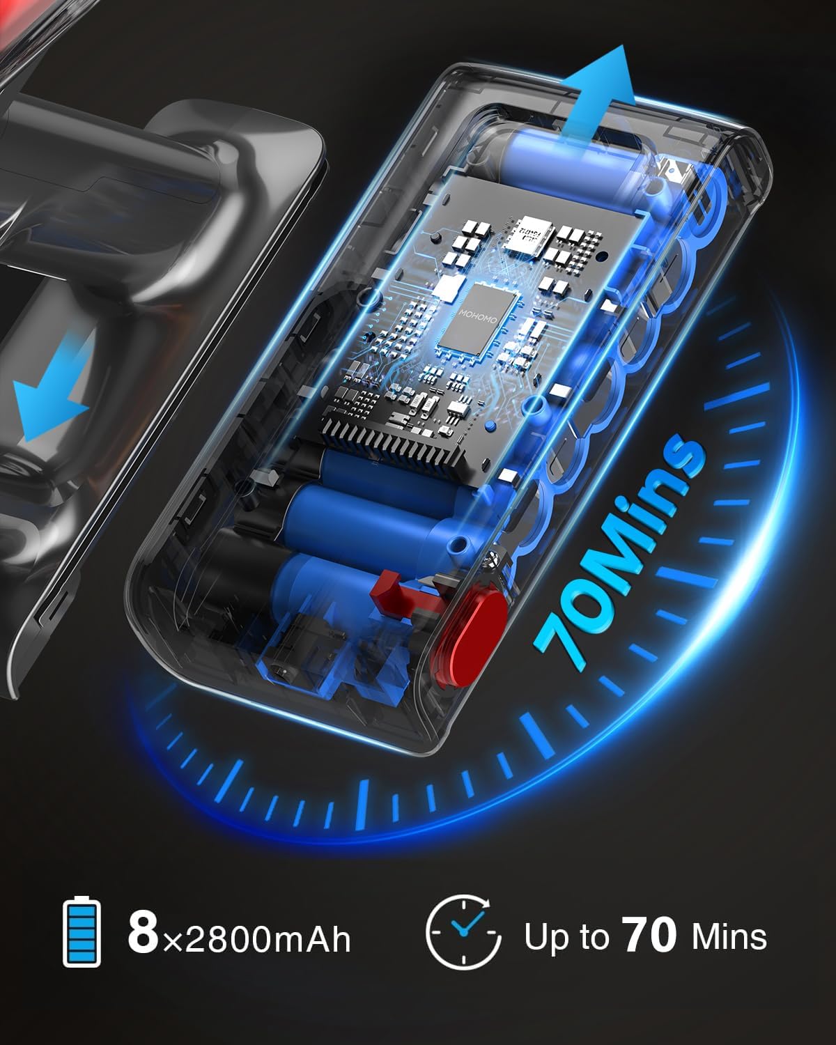 - ➤【 Max 70-min Battery Life & Self-standing Design 】This cordless vacuum cleaner is powered by 8x2800 mAh high-capacity lithium-ion batteries, which radically extends battery runtime. When fully charged (4 hours), the stick vacuum can operate for 20 mins in max suction mode and up to 70 mins in min suction mode. The stick vacuum has a self-standing design that makes it easy to store and recharge for added convenience(Please use MOHOMO's power adapter to charge the battery). Ideal for ‘cleaning the whole house’. A second battery is available for purchase in stores.
