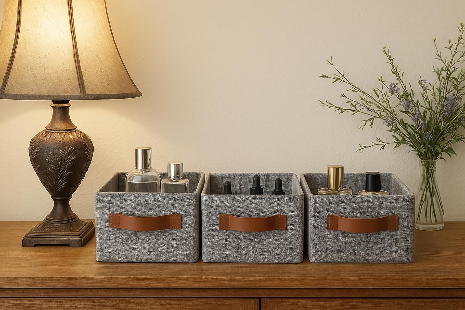 GRANNY SAYS Small Fabric Storage Bins with PU Handles, Storage Baskets for Shelves, Perfume Storage, Narrow Baskets for Organizing DVD, Photos, Aromatherapy, Scarf, Diaper, Cd, 3-Pack, Gray