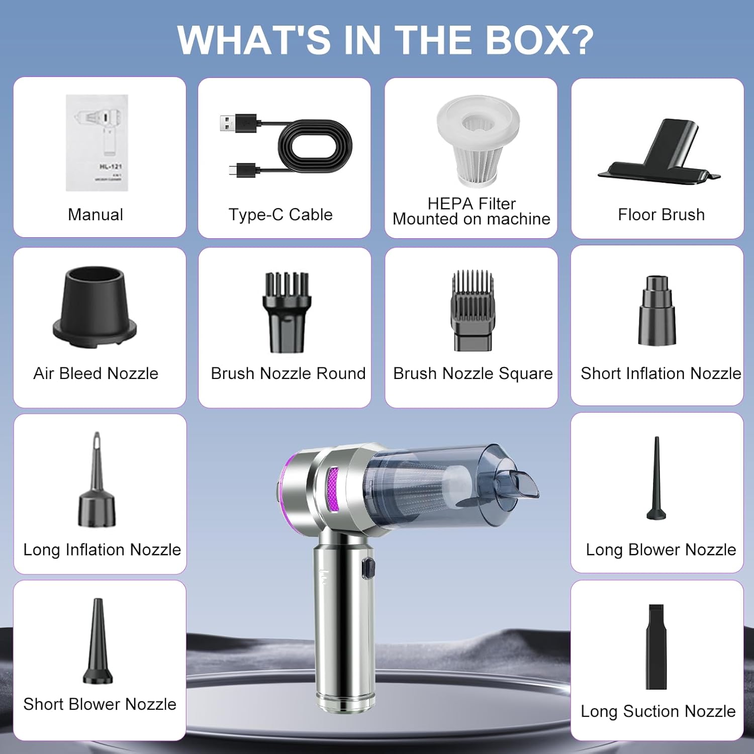 - Included Components : Cleaning Brushes, Filter Cartridge, Main Vacuum Unit, Multiple Nozzle Attachments, Usb-c Charging Cable Cleaning Brushes, Filter Cartridge, Main Vacuum Unit, Multiple Nozzle Attachments, Usb-c Charging Cable