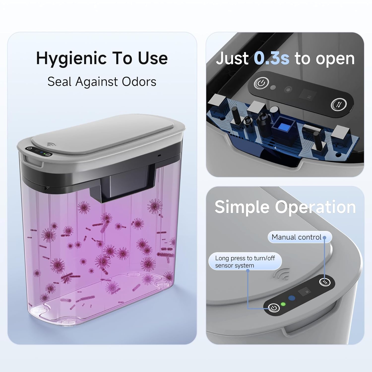 - Special Feature : Motion Sensor, Odor Seal, Removable Lid