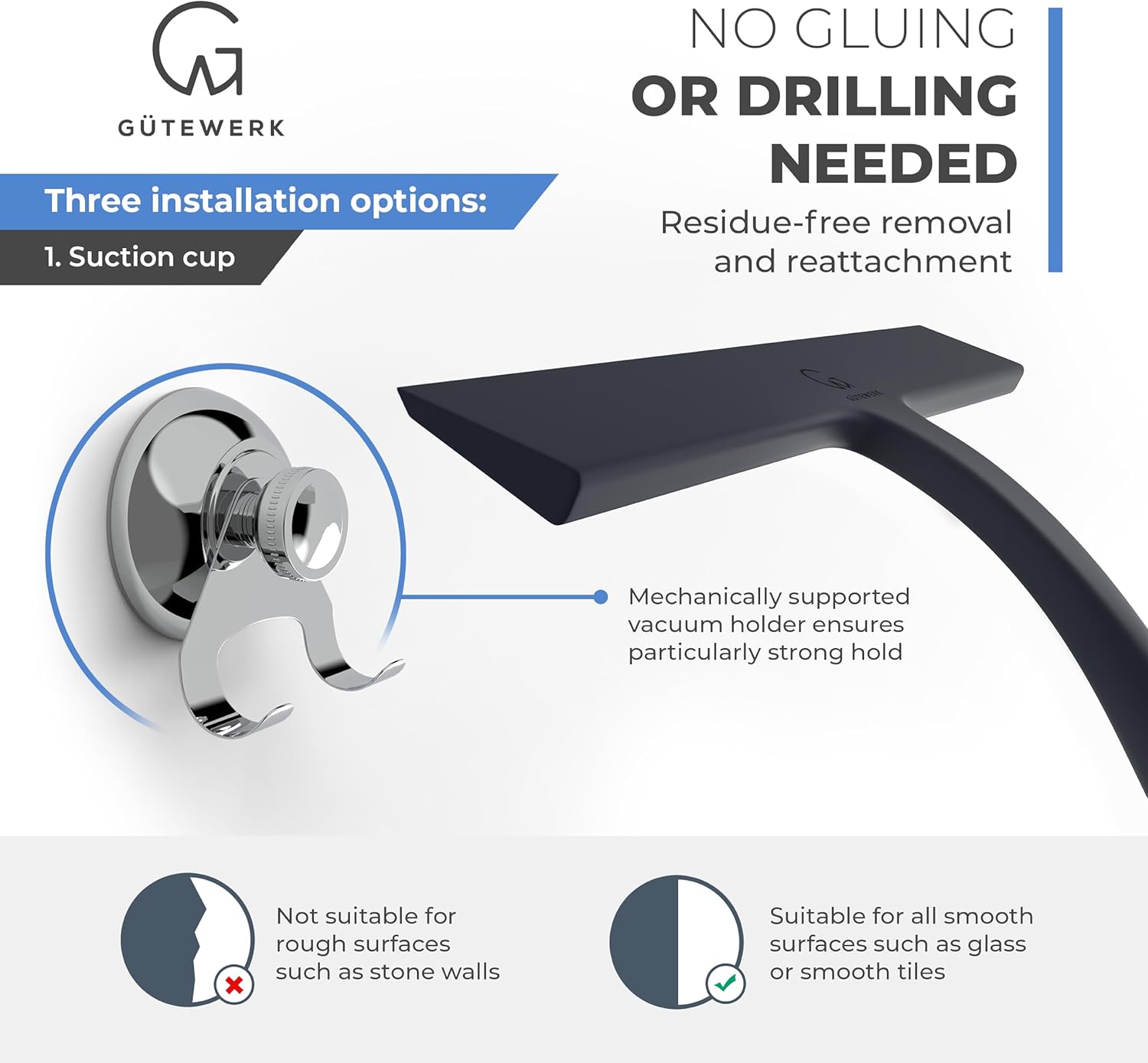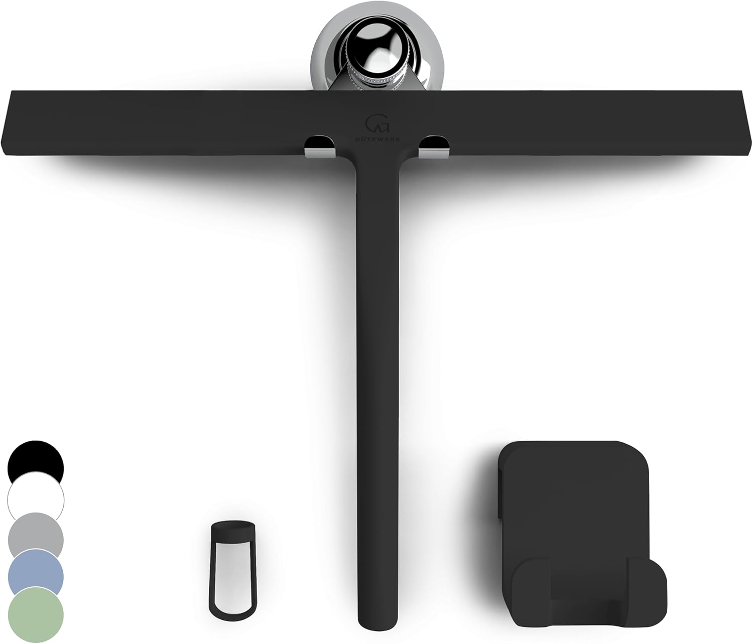 - MINIMALIST TIMELESS DESIGN - The GÜTEWERK glass squeegee is crafted with a matte black finish that impresses with its elegant timeless and smart design. In addition, the chrome-colored stainless-steel hook integrates well with any modern bathroom.