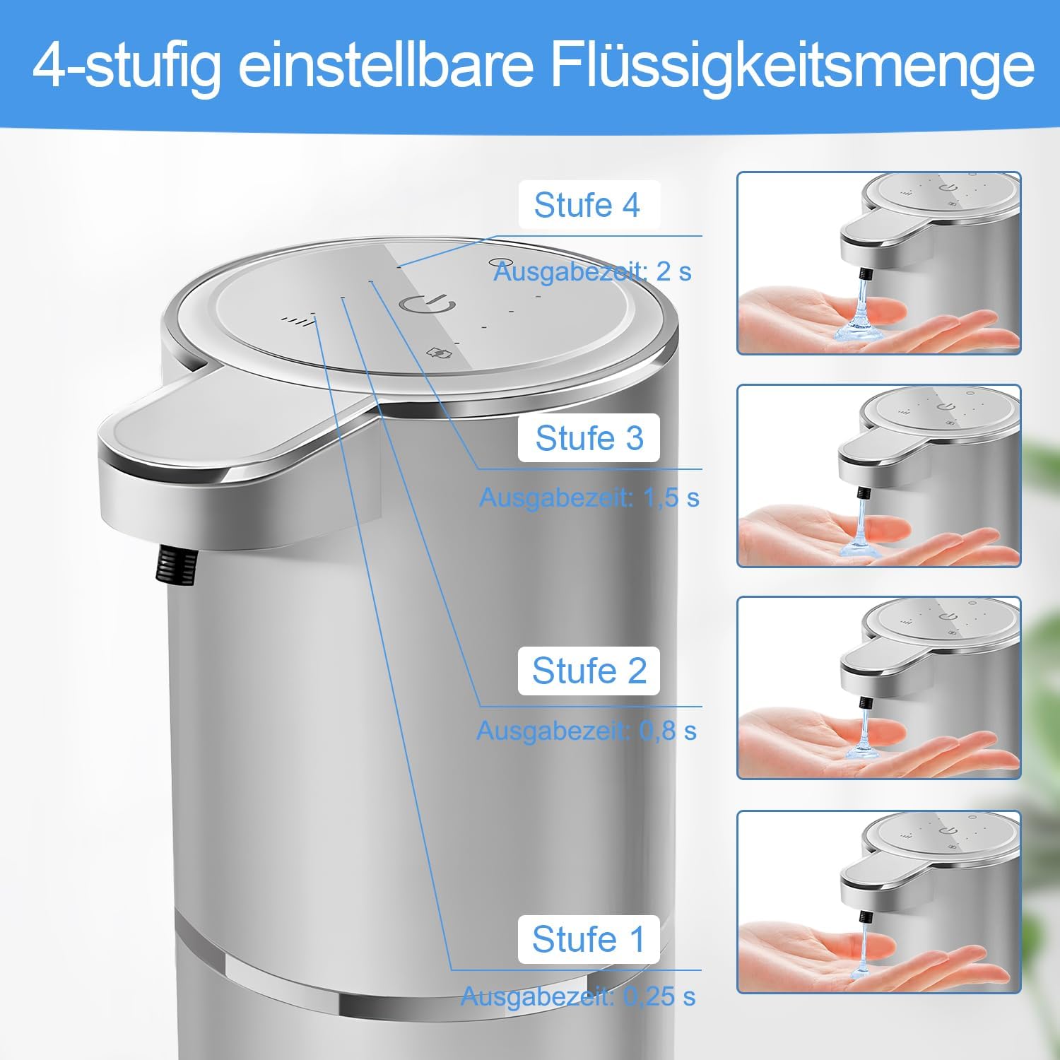 - 🌻 【4-Level Liquid Volume Adjustable】-- There are 4 different Liquid soap dispenser settings for options, only by touch the power button once to adjust the liquid volume ( And keep pressing the power button for 3seconds to turn on/off the dispenser ). The liquid volume weight is 0.5g / 1.5g / 2.4g / 3.2g (Base on each level of liquid soap volume setting) .