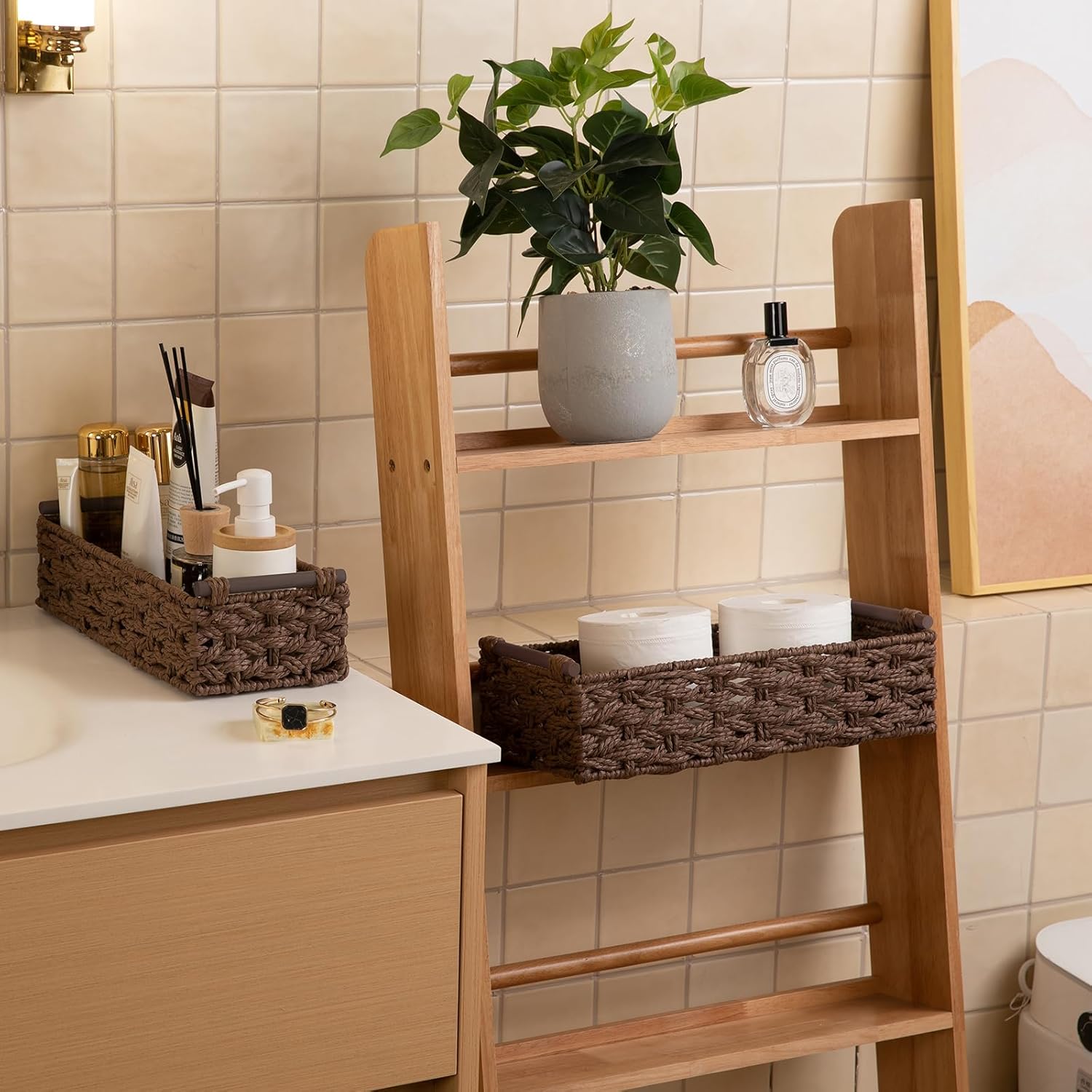 OIAHOMY Toilet Paper Baskets Handmade Paper Rope Decorative Wicker Storage Tank Shelf Cabinet Organizer for Bathroom Home, Set of 2, Brown