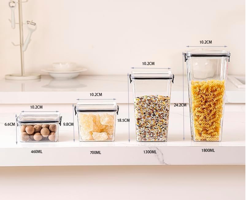 - If used to store four different specifications of grains, it can be applied to different scenarios. This collection includes one 1800ML, one 1300ML, one 700ML, and one 460ML
