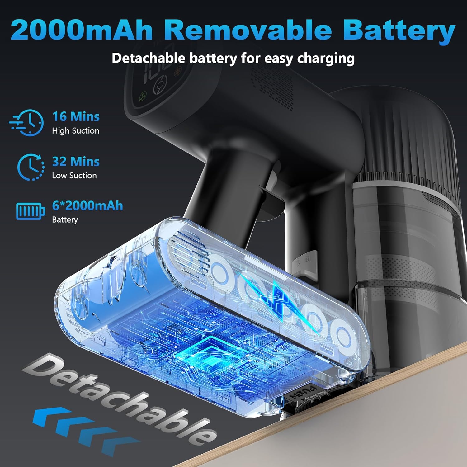 - Wall-Mounted Charging Dock: Featuring a 6*2000 mAh rechargeable battery and a wall-mounted charging station, this cordless vacuum cleaner offers versatile charging options. You can detach the battery for separate charging or place the vacuum on the dock for automatic charging and convenient storage