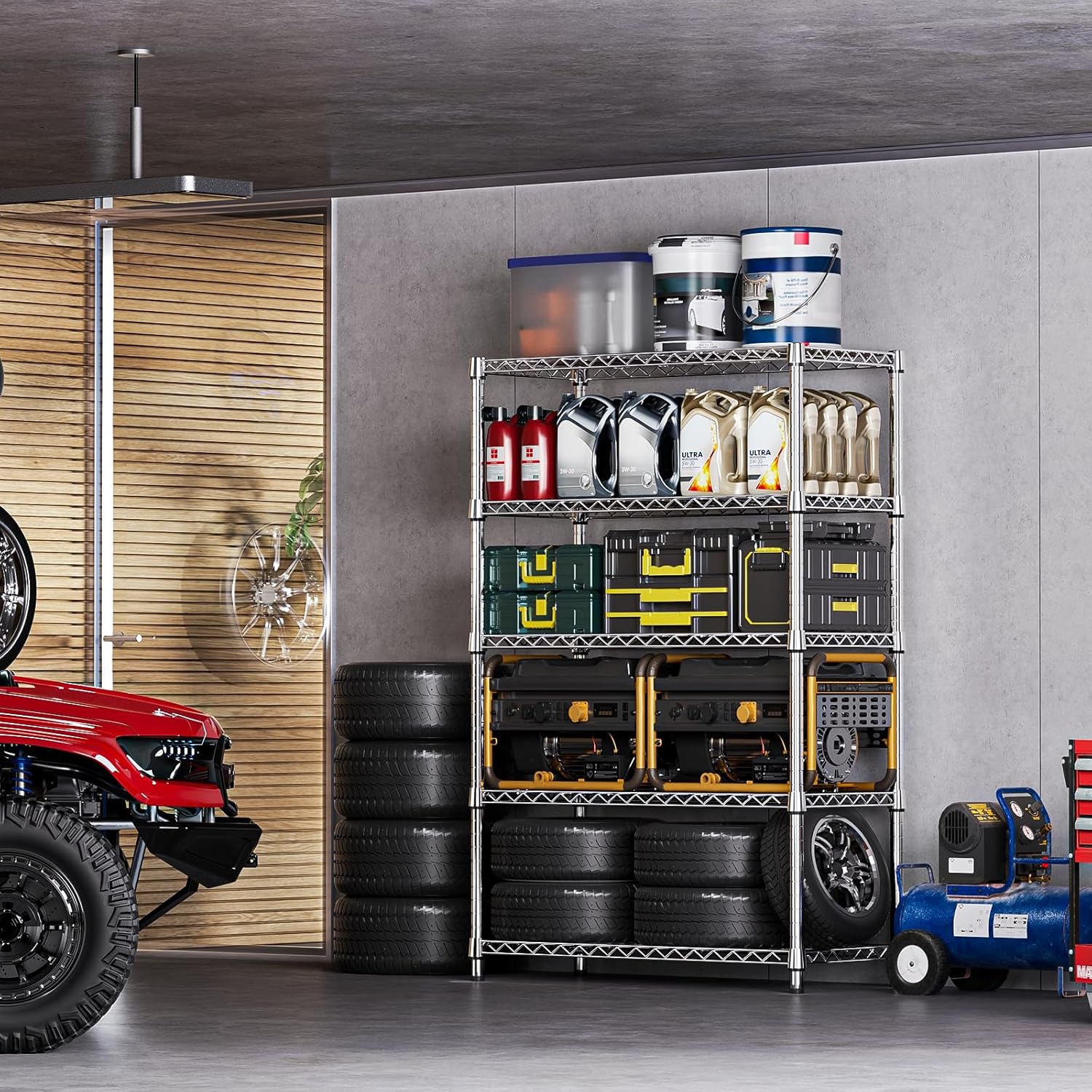 - ăAdjustable Shelves â Flexible for All NeedsăCustomize your storage your way. Each shelf can be easily adjusted in 1-inch increments to fit items of varying sizesâfrom bulky tools to compact kitchenware. This wire shelving unit adapts to your unique storage needs, creating a more organized and efficient space.