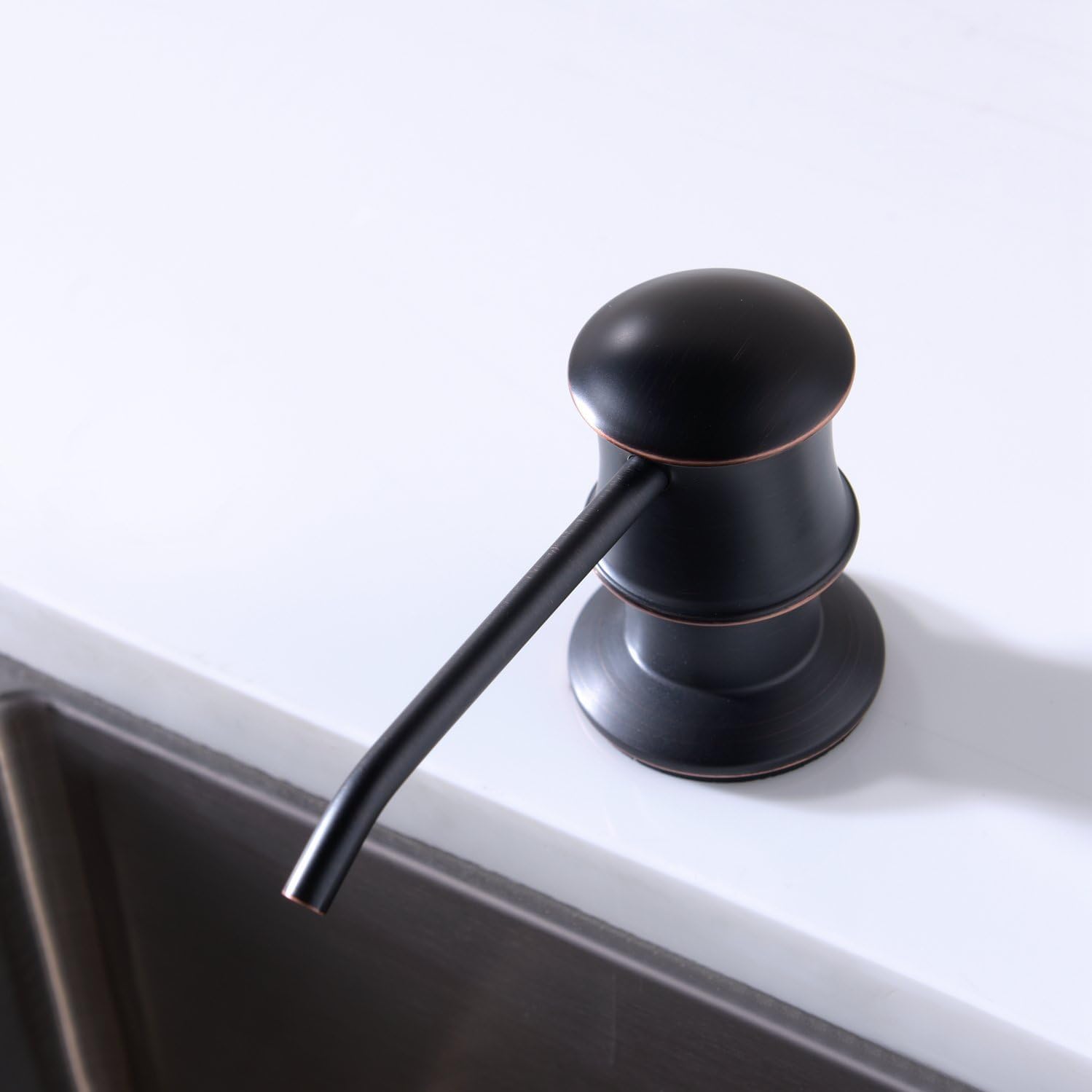 - The built-in design makes your kitchen countertop look clean and tidy,The classical shape paired with the oil-rubbed bronze color creates a high end aesthetic combination.Pls note:first pump takes about 50 presses, but there’s a hose piece that keeps soap from sliding back into the container. So you’ll never have to do that again.