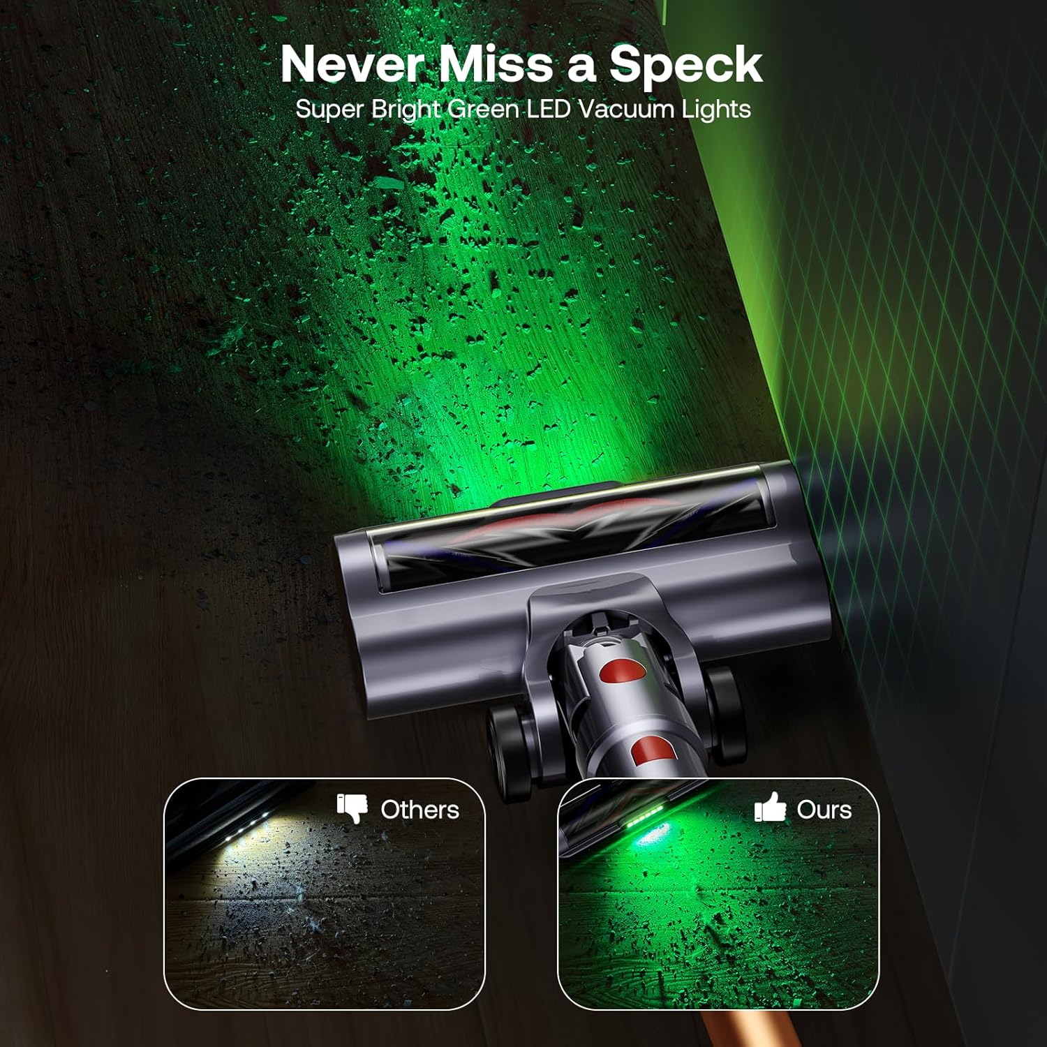 - [Green LED Headlight & Wide-Angle Floor Brush] Upgraded Green LED headlight projects a long-range beam to expose hidden debris under furniture. The green light offers superior dust visibility over white lights. Combined with wide swivel steering, Trucozie T550 vacuum cleaner for home easily cleans around obstacles and under low furniture. white lights. Combined with wide swivel steering, Trucozie T550 vacuum cleaner for home easily cleans around obstacles and under low furniture.
