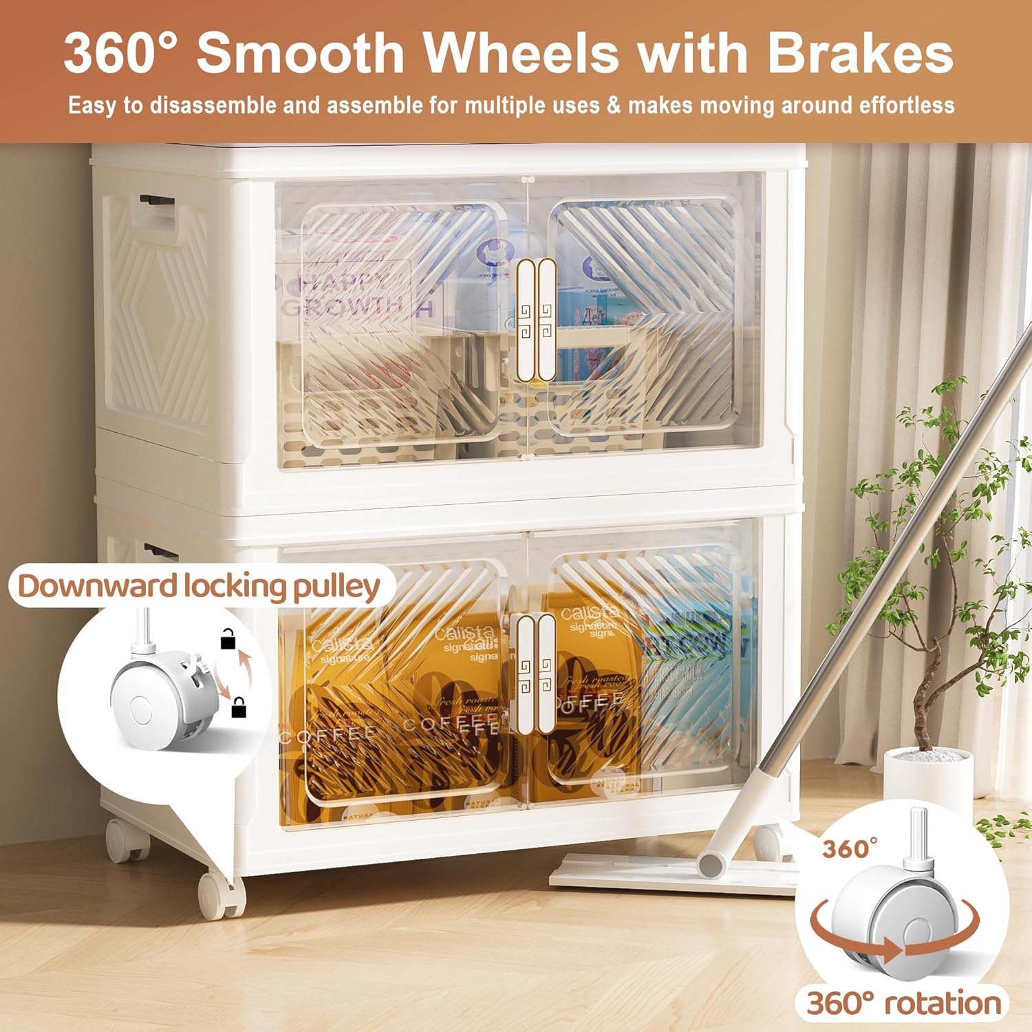 - 【Stackable and Moveable Design】Pioncrey storage bins with lid can be stacked seamlessly, saving storage space and maintaining aesthetics. The locking mechanism and grooves on both sides ensure the stability, compactness, and convenience of handling or of the storage containers. Four 360°Smooth wheels are built into the bottom of the storage cabinet for easy cleaning or movement, 2 of which are equipped with brakes for securing plastic storage bins
