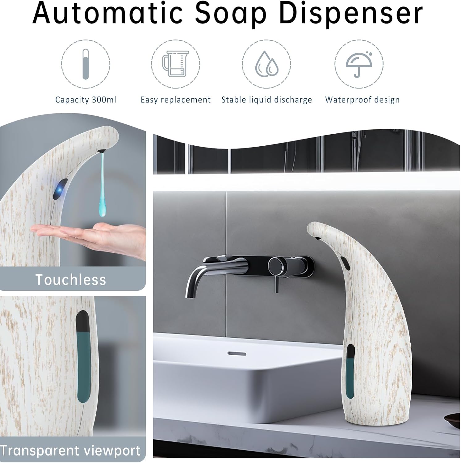 - 【Elegant Woodgrain Design】This plastic soap dispenser features a premium woodgrain finish that adds natural warmth to any space. The auto hand soap dispenser blends beautifully with farmhouse, modern or traditional decors while being easy to clean and maintain. Its scratch-resistant surface stays looking new even with daily use.