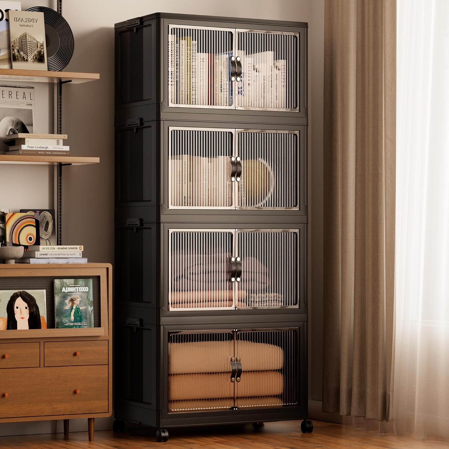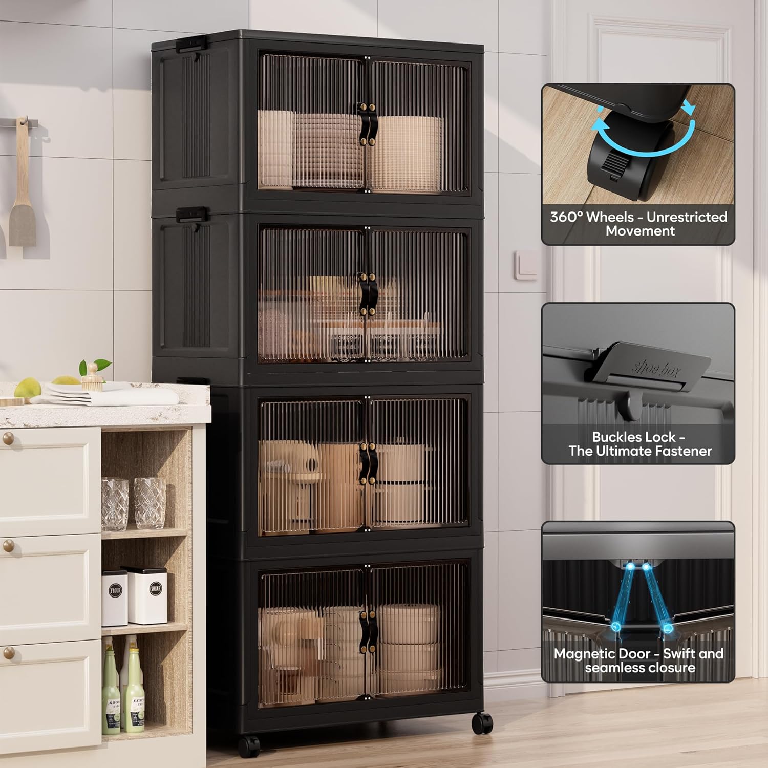 - 【Magnetic Doors & Rotating Wheels】The bins offer two opening options: front or top. The magnetic closure allows easy access. The 4 rotating 360-degree wheels make them easy to move, ideal for use in storage and organization in any room like your closet or bathroom.