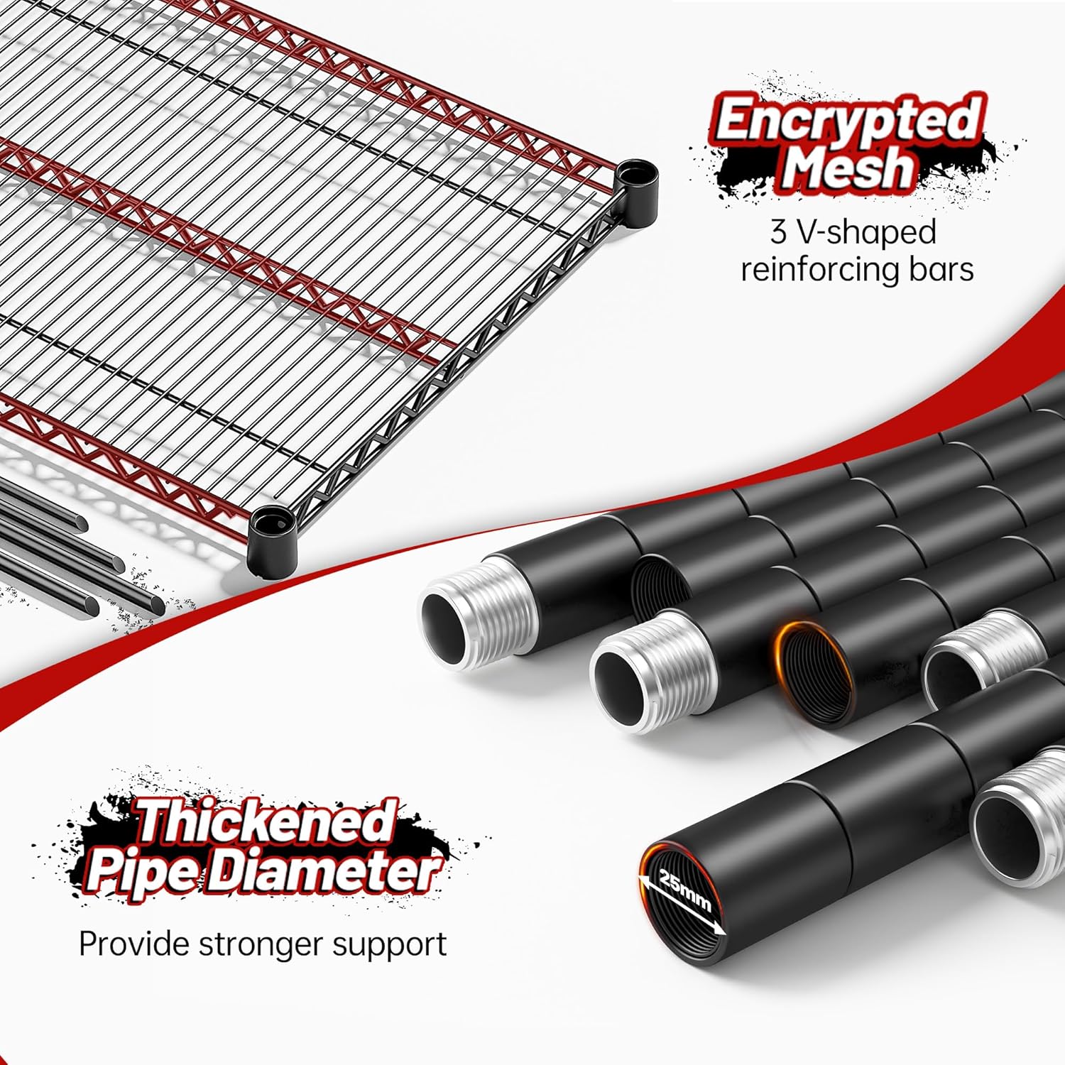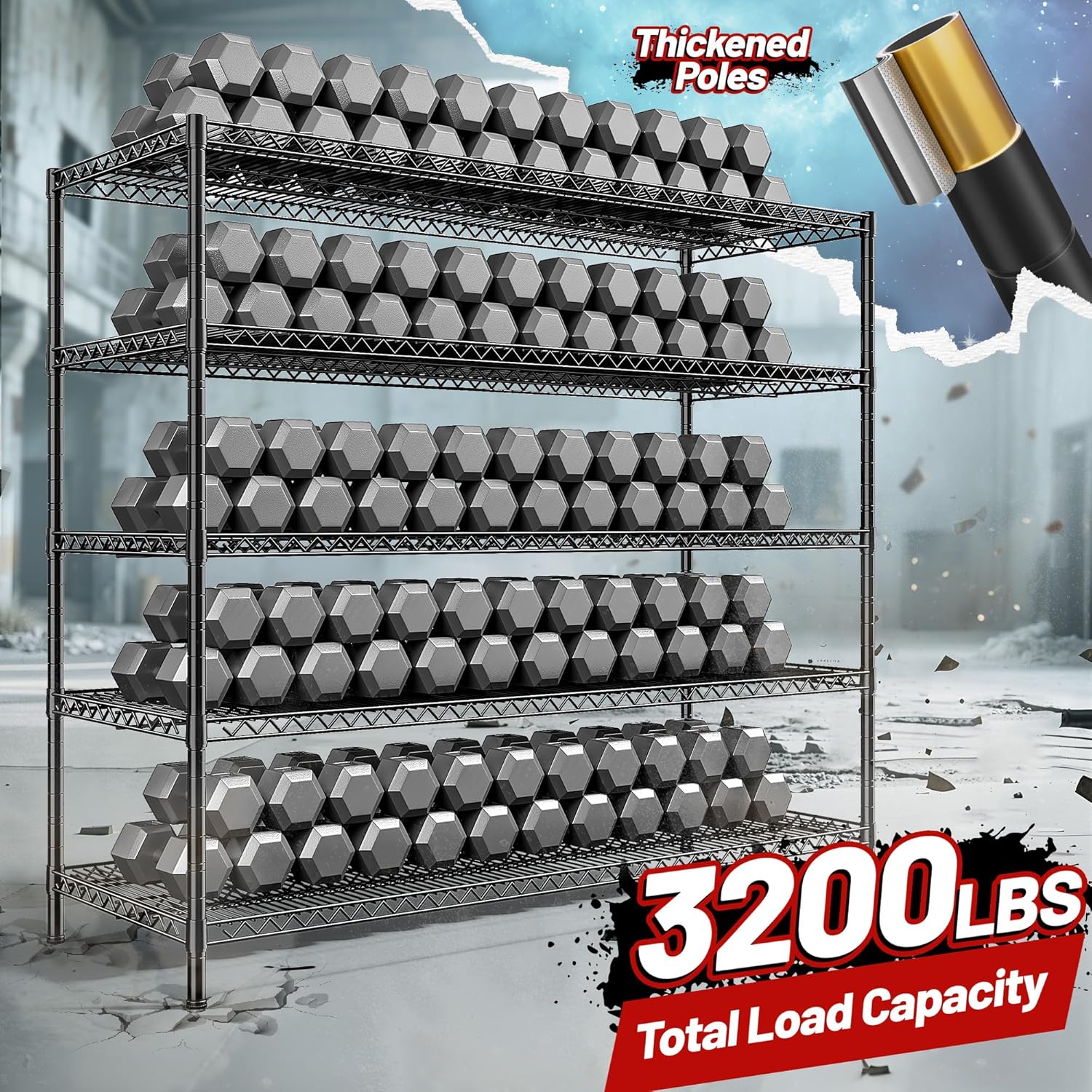 - [3200lbs Capacity Heavy Duty Wire Shelving Unit] Metal Shelving are made of sturdy heavy duty steel wire and 25.2mm diameter metal rods, with extra reinforced support bars on each level of the metal shelves, with a single tier load capacity of 640lbs and a total load capacity of 3200lbs.