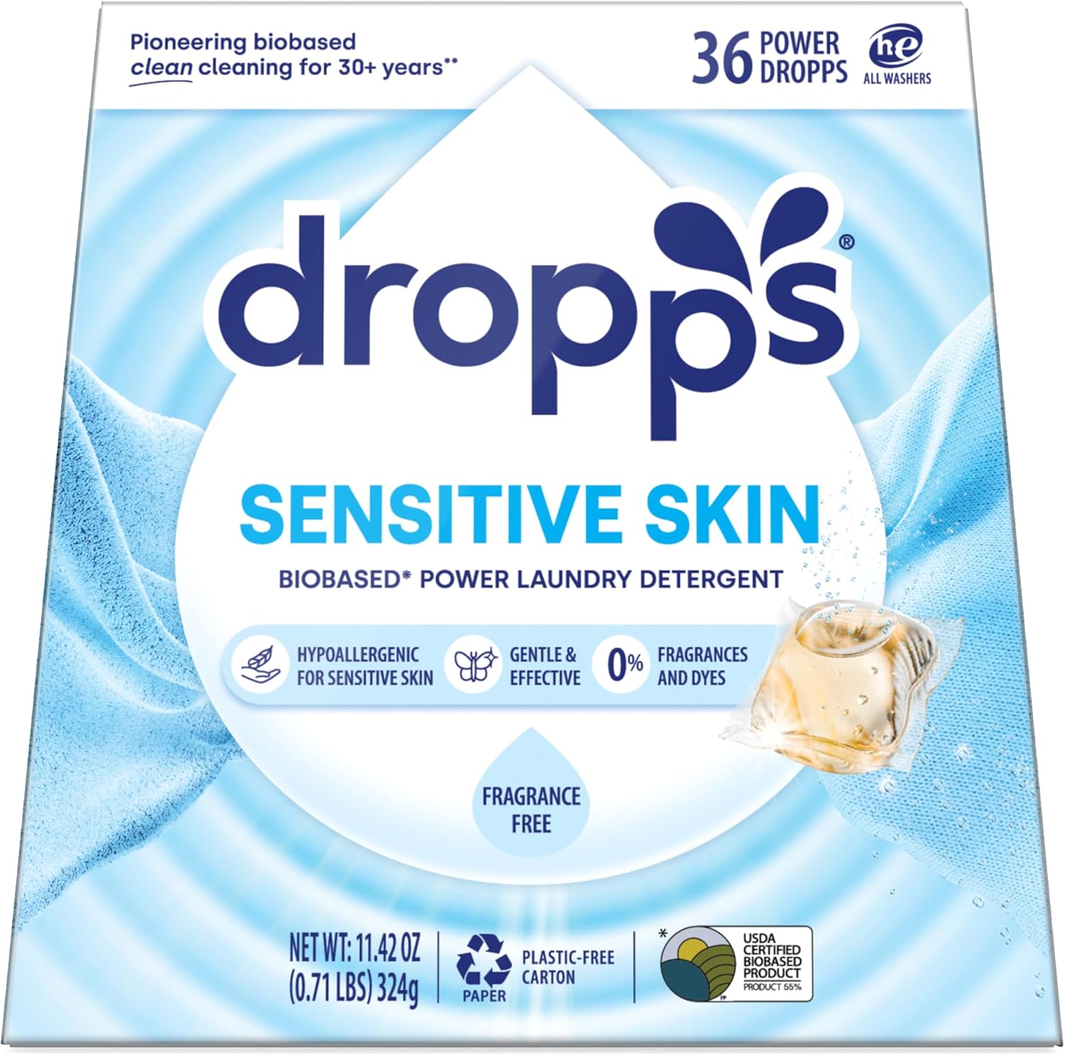 - GENTLE YET STRONG: Dropps Sensitive Skin Laundry Detergent Pods harness the power of bioscience for gentle cleaning, designed for sensitive skin. These pods are formulated with a blend of surfactants to eliminate dirt and stains while being kind to your skin. Each pod is pre-measured for convenience, reducing waste and making laundry easy. These laundry pods are made without fragrances and enzymes to be extra gentle on sensitive skin. Unscented. 36 pods.