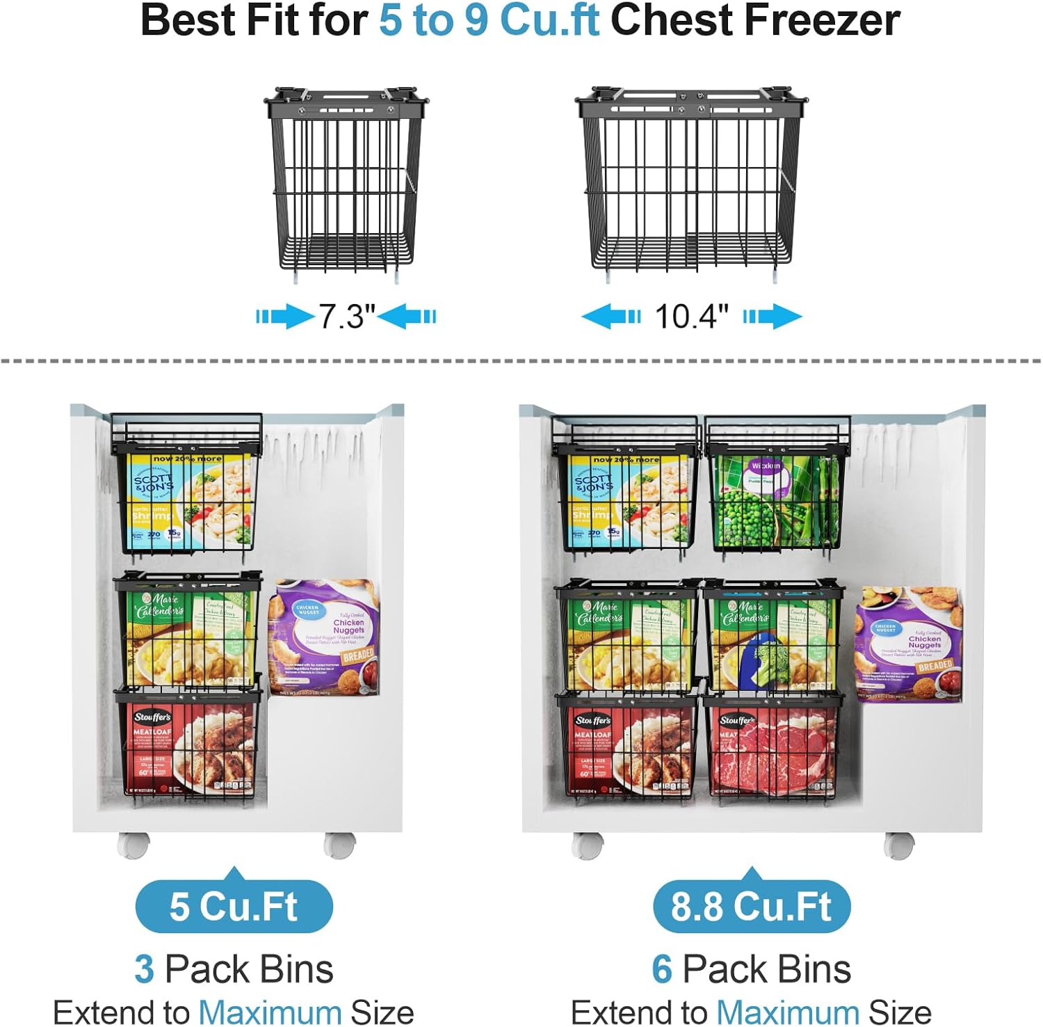 - [Easy to Get & Rearrange] Fold down the handles to stack the chest freezer organizer bins to fully use the freezer space; Easily lift the bottom basket to get items, When organizing the freezer, just need to rearrange the chest freezer basket, without having to rearrange each package of food