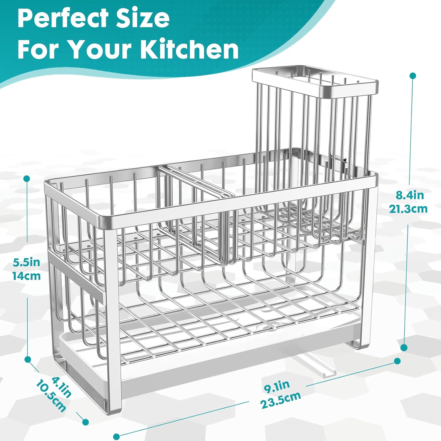 - 【DOUBLE LAYER CAPACITY】Measures 9.1" x 4.1" x 8.4". Our sink sponge holder is larger than the sponge rack on the market. Can holds 2 detergent bottles, a sponge ball, a stainless steel scrubber and sink stopper at the same time. With an extra upgraded brush holder that can hold up to 4 small and large sized brushes, with the Sinnsally sink caddy you can save countertop space perfectly. Please measure the size of your sink before buying this product.