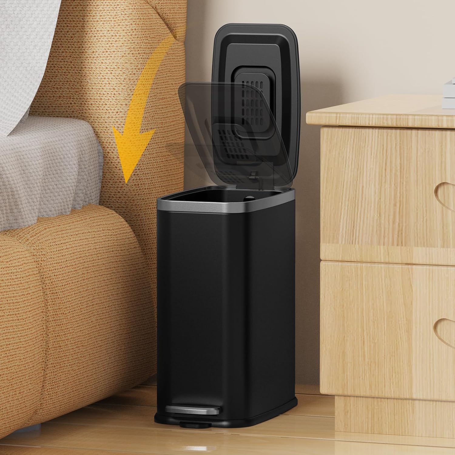 Stainless Steel Bathroom Trash Can with Lid Soft Close,1.6 Gallon Slim Garbage can,Small Metal Step Wastebasket for Office, Bedroom, Toilet, Black