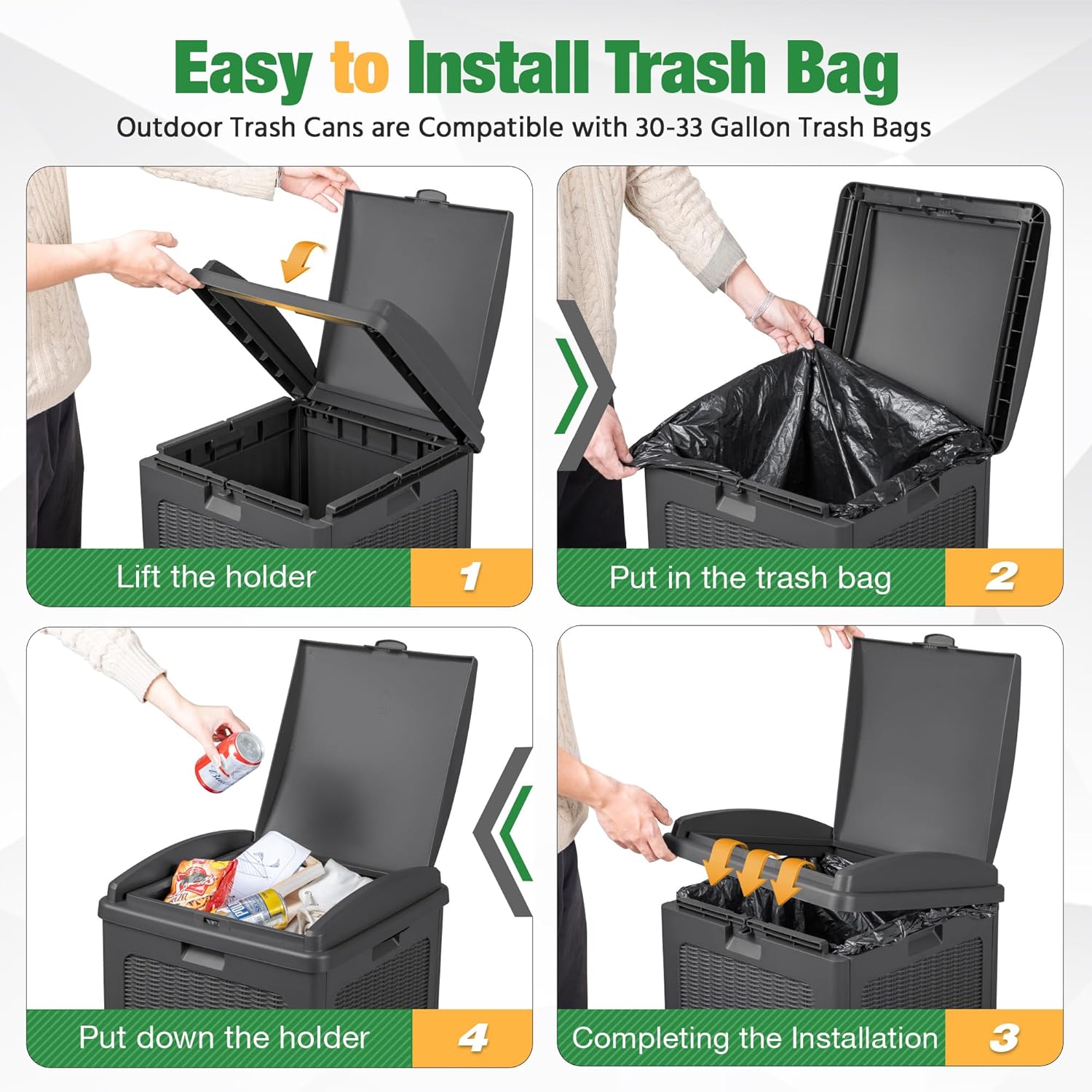 - Easy to Install Trash Bags: The waste bin for outdoors is compatible with 30-33 gallon trash bags. You need to lift the trash bag holder, put on the trash bag, put down the holder, and then finish the installation. After opening the inner lid, the garbage bag can be stably fixed in the card slot